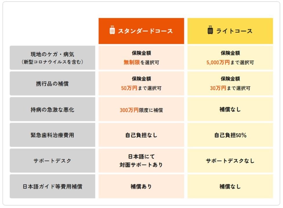 スタンダードコースでは、現地でのケガや病気に備えて治療・救援費用の保険金額を無制限にすることが可能であったり、緊急歯科治療費用を自己負担なしで補償するなど、手厚い補償をご提供します。また、サポートデスクでの日本語による対面サポートにより、お客さまのご旅行に更なる安心をお届けします。
