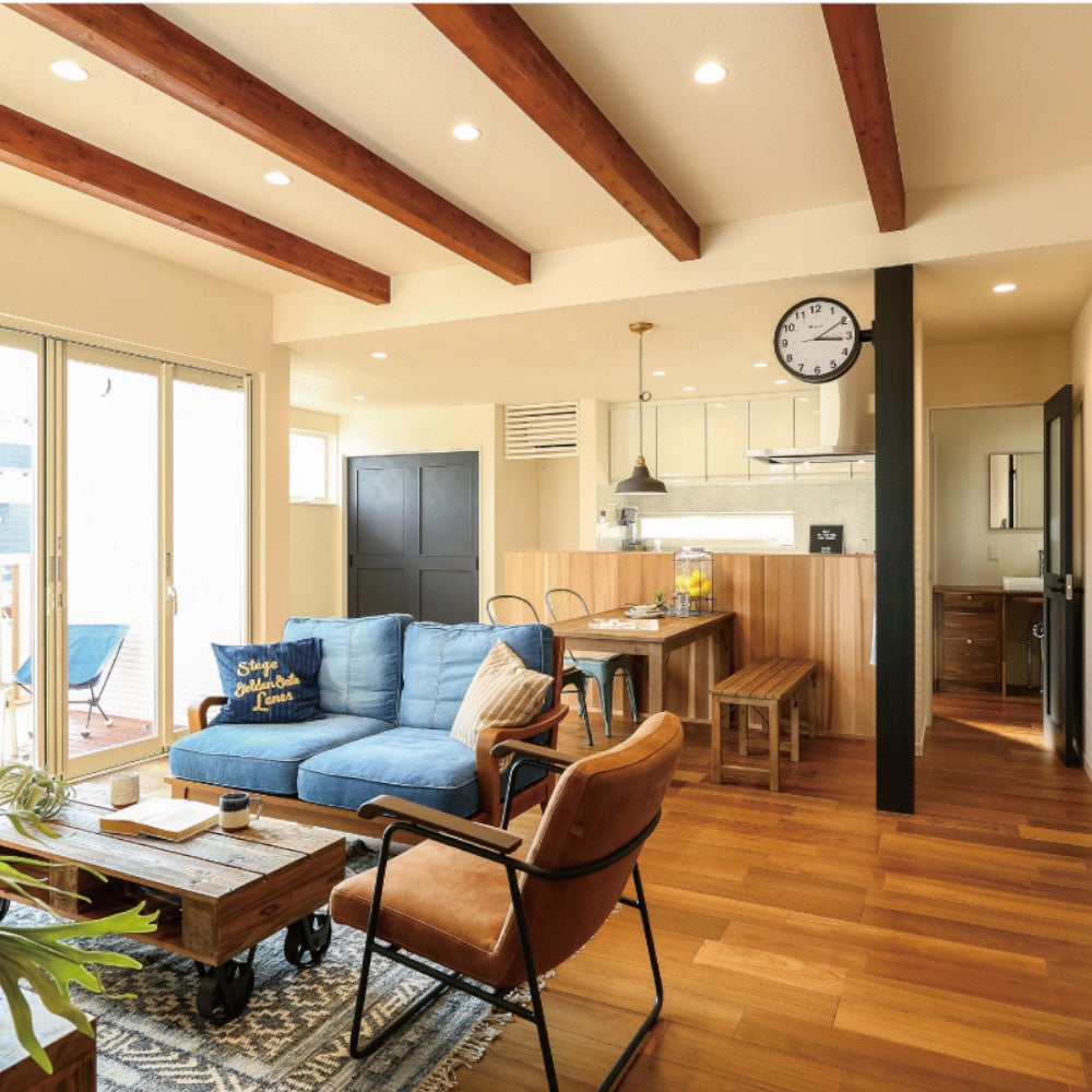 施主様はアメカジが好きなご夫婦で、ご自身の服装や好みのインテリアとマッチする住まいをご希望されておりました。西洋風の外壁やアメリカンな雰囲気にするウッドデッキ、家事動線を短くした間取りの工夫など注文住宅ならではのこだわりがたっぷり詰まったお住まいとなっております。