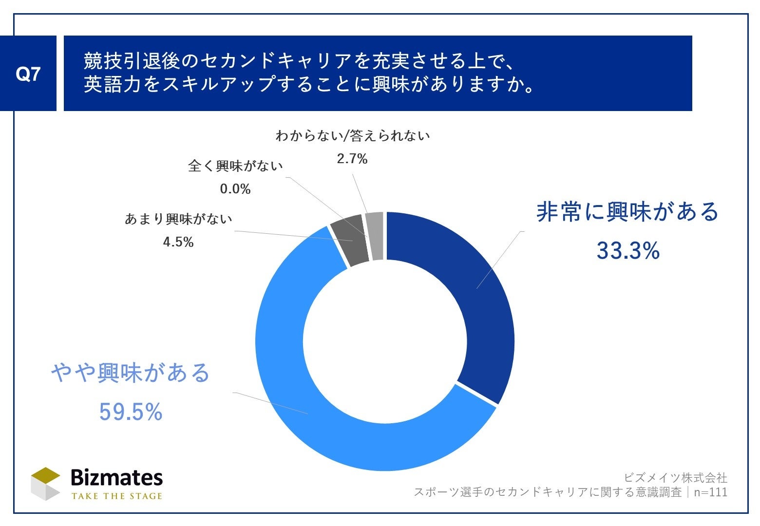 「Q7.競技引退後のセカンドキャリアを充実させる上で、英語力をスキルアップすることに興味がありますか。」(n=111)と質問したところ、「非常に興味がある」が33.3%、「やや興味がある」が59.5%という回答となりました。