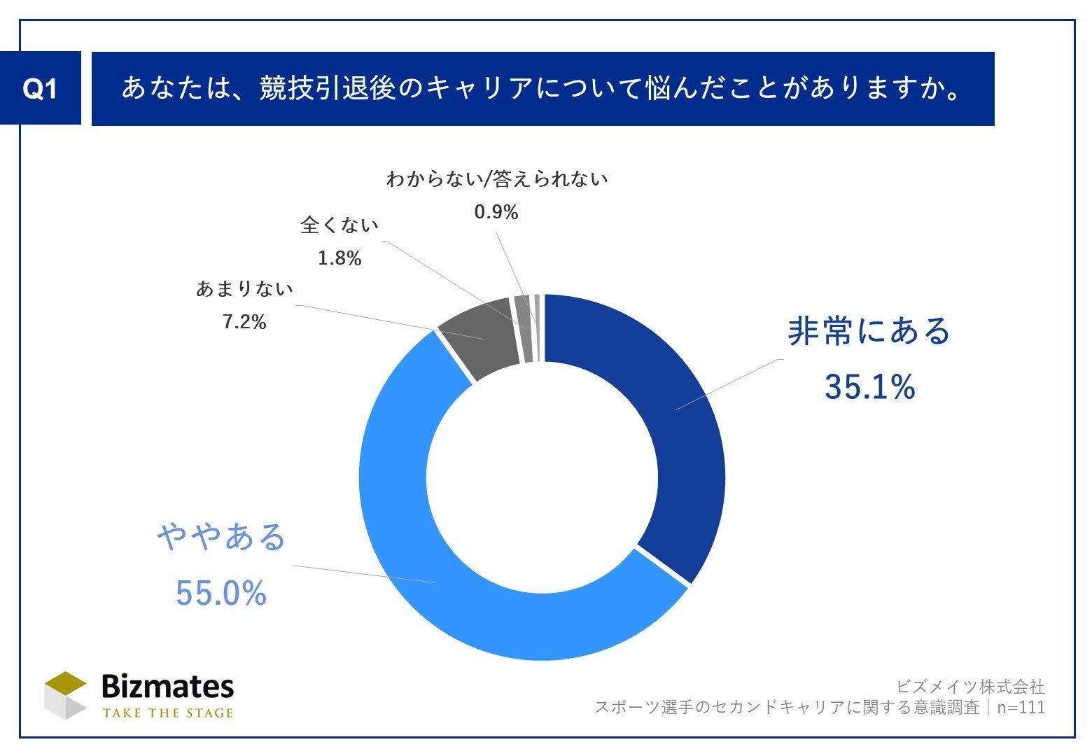 「Q1.あなたは、競技引退後のキャリアについて悩んだことがありますか。」(n=111)と質問したところ、「非常にある」が35.1%、「ややある」が55.0%という回答となりました。