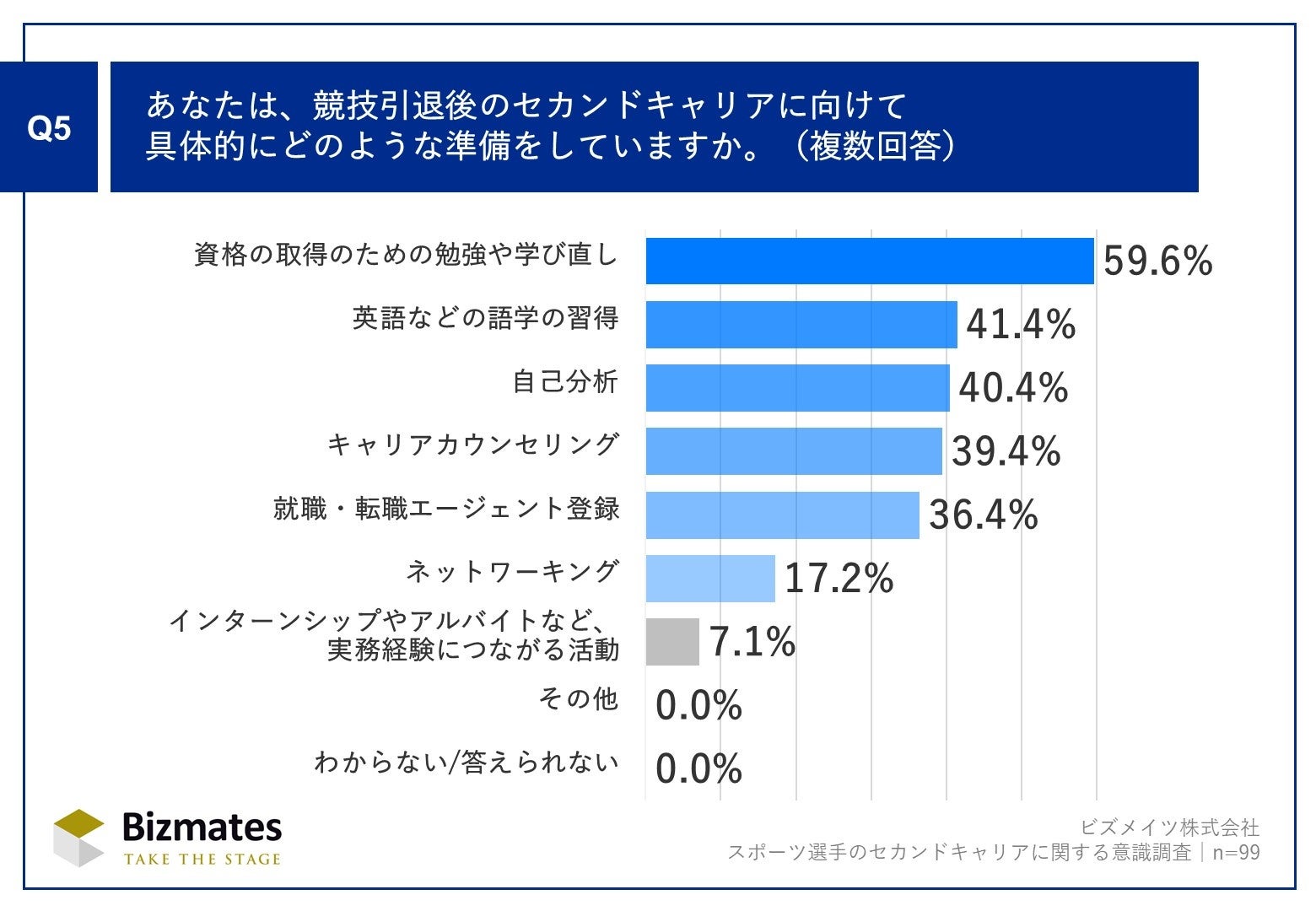 Q4で「ある」と回答した方に、「Q5.あなたは、競技引退後のセカンドキャリアに向けて具体的にどのような準備をしていますか。(複数回答)」(n=99)と質問したところ、「資格の取得のための勉強や学び直し」が59.6%、「英語などの語学の習得」が41.4%、「自己分析」が40.4%という回答となりました。