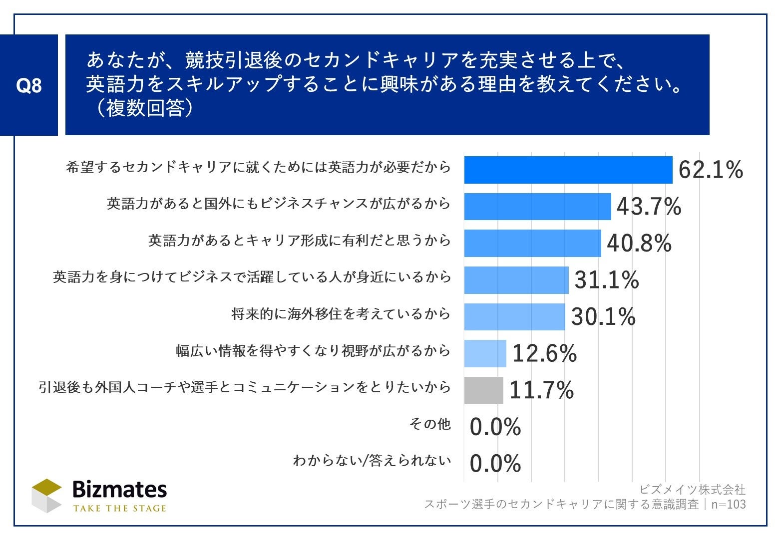 Q7で「非常に興味がある」「やや興味がある」と回答した方に、「Q8.あなたが、競技引退後のセカンドキャリアを充実させる上で、英語力をスキルアップすることに興味がある理由を教えてください。(複数回答)」(n=103)と質問したところ、「希望するセカンドキャリアに就くためには英語力が必要だから」が62.1%、「英語力があると国外にもビジネスチャンスが広がるから」が43.7%、「英語力があるとキャリア形成に有利だと思うから」が40.8%という回答となりました。