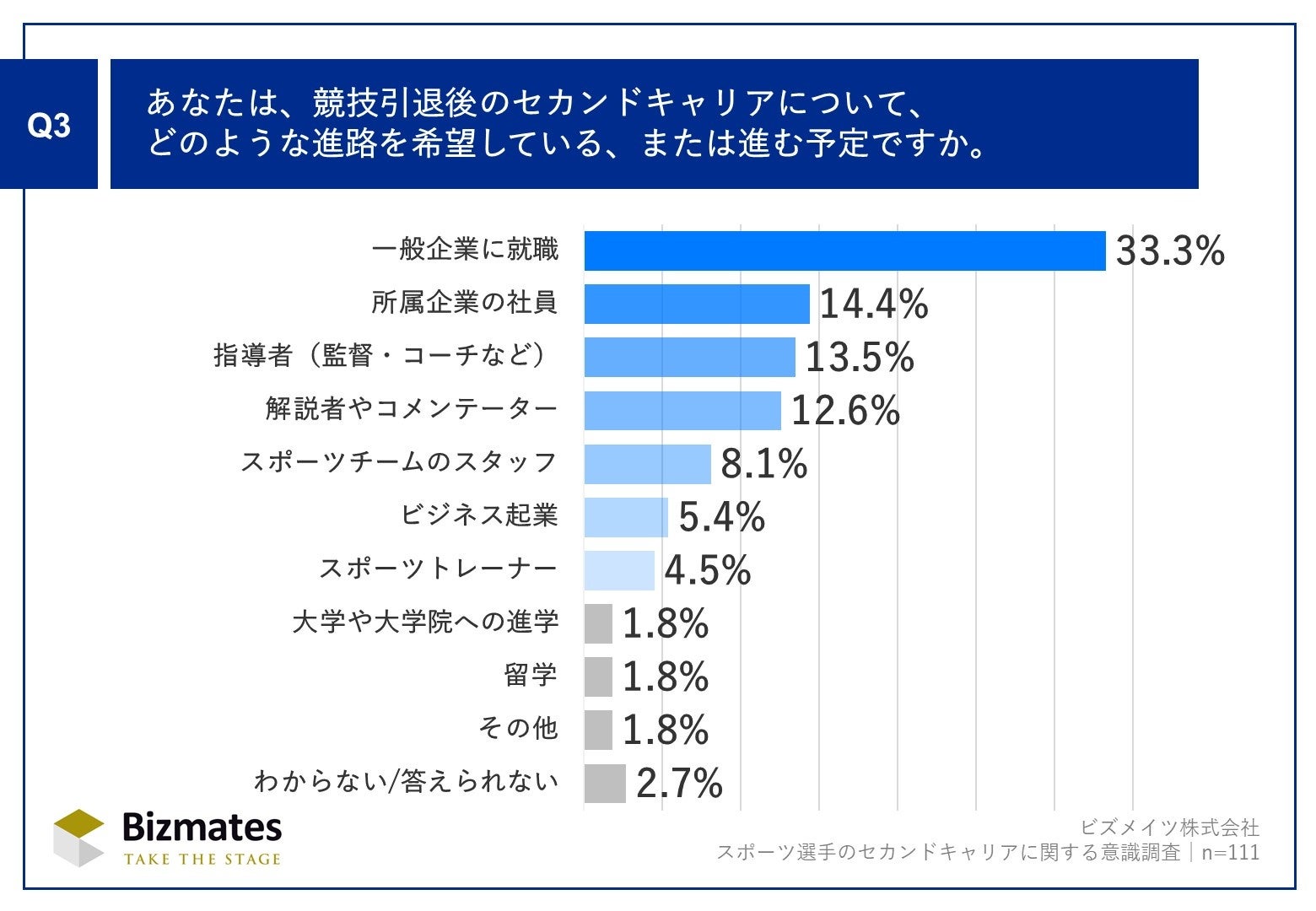 「Q3.あなたは、競技引退後のセカンドキャリアについて、どのような進路を希望している、または進む予定ですか。」(n=111)と質問したところ、「一般企業に就職」が33.3%、「所属企業の社員」が14.4%、「指導者(監督・コーチなど)」が13.5%という回答となりました。