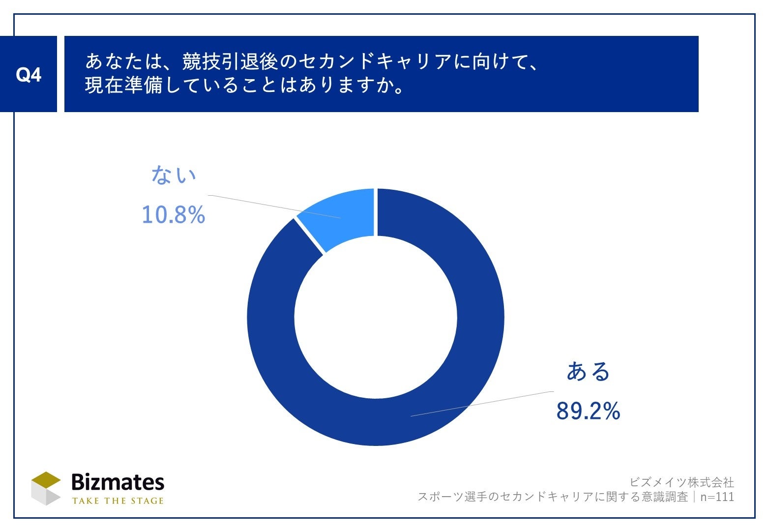 「Q4.あなたは、競技引退後のセカンドキャリアに向けて、現在準備していることはありますか。」(n=111)と質問したところ、「ある」が89.2%、「ない」が10.8%という回答となりました。