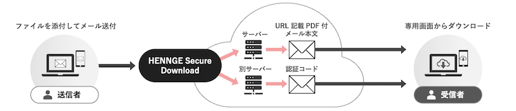 HENNGEが2021年10月にリリースした、クラウドセキュリティサービス「HENNGE One」の脱PPAP機能です。送信者はこれまで通りファイルをメールに添付して送るだけで、ファイルが自動的にクラウドストレージにアップロードされ、受信者には本文と、ダウンロードURLが記載されたPDFが届きます。受信者が自身のメールアドレスの認証をリクエストすると、認証コードが別経路で送信されます。受信者ごとにダウンロードURLを発行するため、受信者だけが認証を行い、ファイルをダウンロードできます。また、万が一誤ったファイルを添付しても、送信後にURLの無効化ができます。