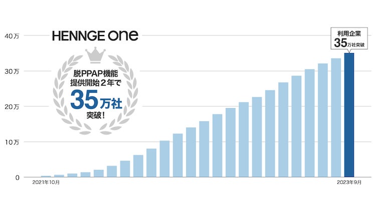 HENNGEは2021年10月、クラウドセキュリティサービス「HENNGE One」の1機能として、脱PPAPソリューション「HENNGE Secure Download」の提供を開始しました。「HENNGE Secure Download」はシンプルな操作性と高い安全性が評価され、上場企業をはじめ幅広い業種の企業や自治体で導入が進み、2023年1月には利用企業20万社を超えました(※3)。そしてこの度、提供開始から約2年で利用企業が35万社を突破しました。