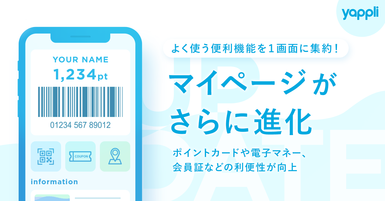 アプリプラットフォーム「Yappli(ヤプリ)」を提供する株式会社ヤプリ(本社:東京都港区、代表取締役:庵原保文、以下「ヤプリ」)は、2022年9月20日(火)、ポイントカード・会員証などを表示するマイページのアプリデザインを刷新したことをお知らせいたします。