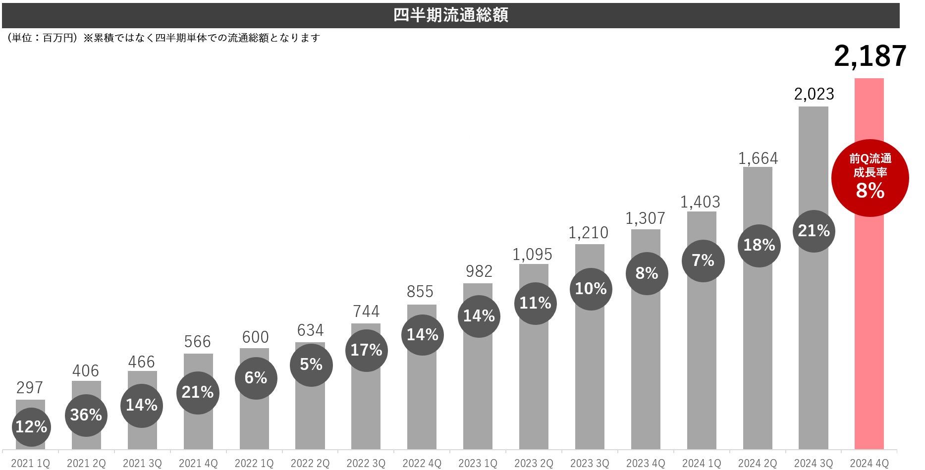 当社は、2027年9月期流通総額1,000億円の目標(※)に向けて、資金移動業の取得、デジタル給与払いの取得に向けた動きなど、サービスとしての品質向上、また、カスタマーサクセスによるクライアント満足度向上及び営業活動の強化を推進しております。結果として、2024年9月期第4四半期において流通総額が21億円を突破、18四半期連続成長を実現いたしました。