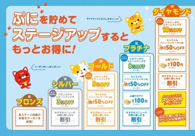 お得なクーポンや最新の情報を発信する「デニーズアプリ」のステージには、アプリ内で貯まるポイント(ぷに)※に応じて「ブロンズ」から「ダイヤモンド」までステップアップできる5段階があります。この度、「デニーズアプリ」を使えば使うほど、お得にデニーズを楽しめるこの制度をリニューアルします。また、これまで以上にお客様に合わせたきめ細やかなクーポンや情報の発信を強化していきます。