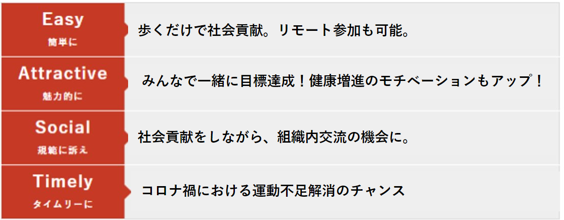 社会貢献を入り口に社内のウォーキングイベントに参加し、「誰かのために」がモチベーションとなり、継続(=従業員の運動習慣定着)に繋がる本取り組みについて、以下のとおり、ナッジ(※)の意思決定フレームワークで表すことができます。