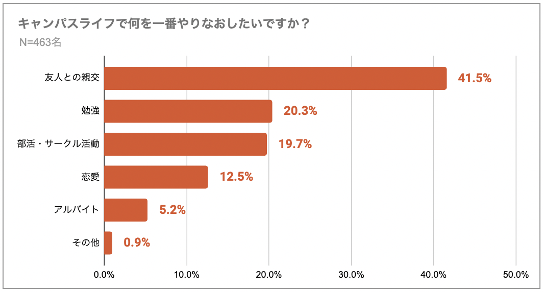 「やり直したい」と回答した人に、何を1番やり直したいかを問うと「友人との親交」が41.5%を占める結果となり、2位の「勉強」と20ポイント以上の差をつける結果となりました。