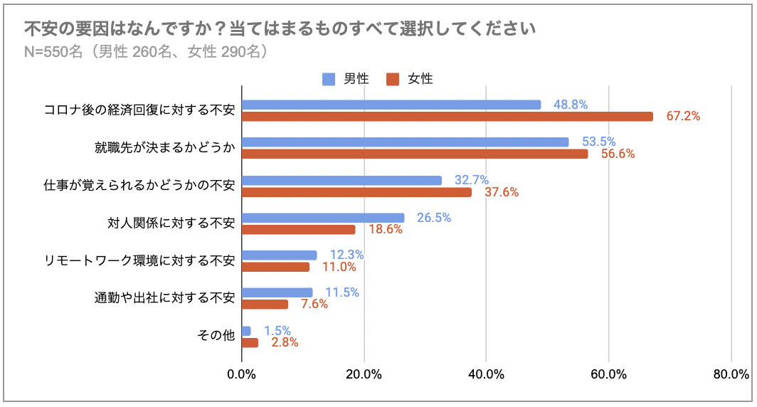 - 就職に不安74.9%で「コロナ後の経済回復」「就職先が決まるかどうか」も半数以上。