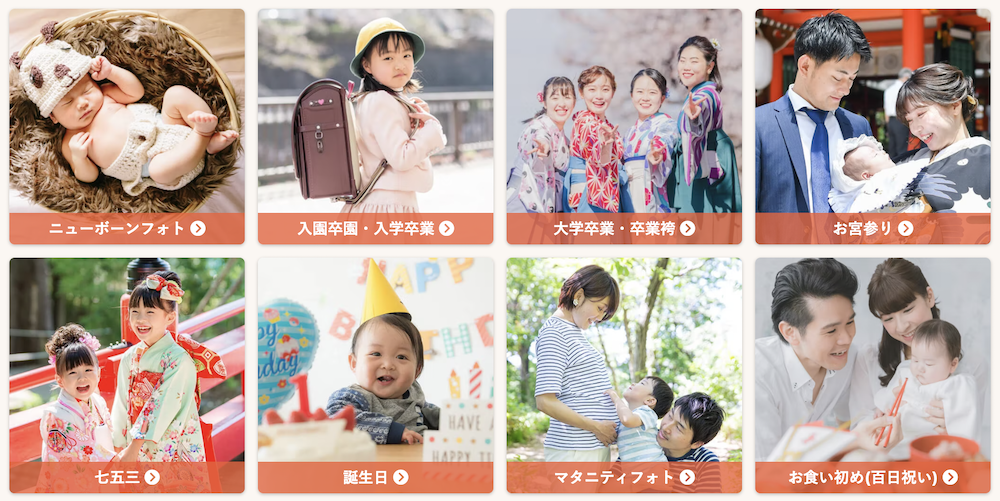 マタニティ、ニューボーン(新生児)、お宮参り、誕生日、七五三、卒入園・卒入学、成人式、結婚式の前撮り・後撮り、長寿祝いなど、ご家族の記念日に寄り添う「我が家の専属カメラマン」として、全国のご家族にご利用いただいています。