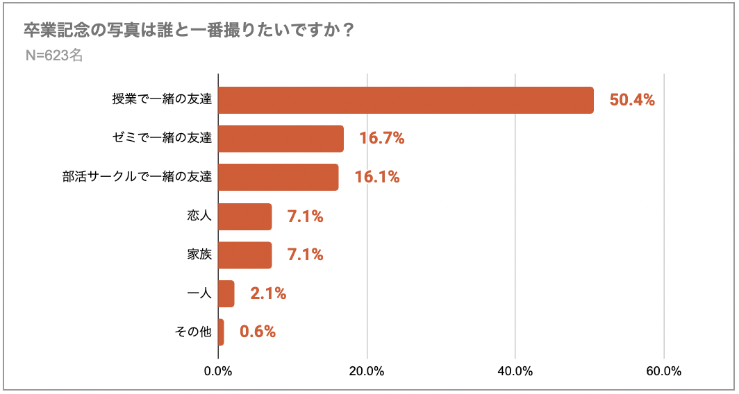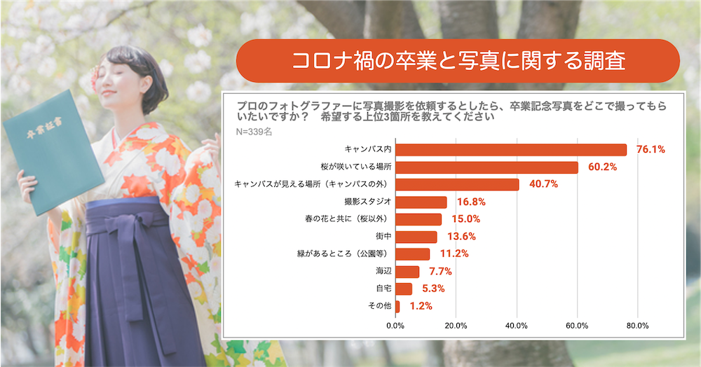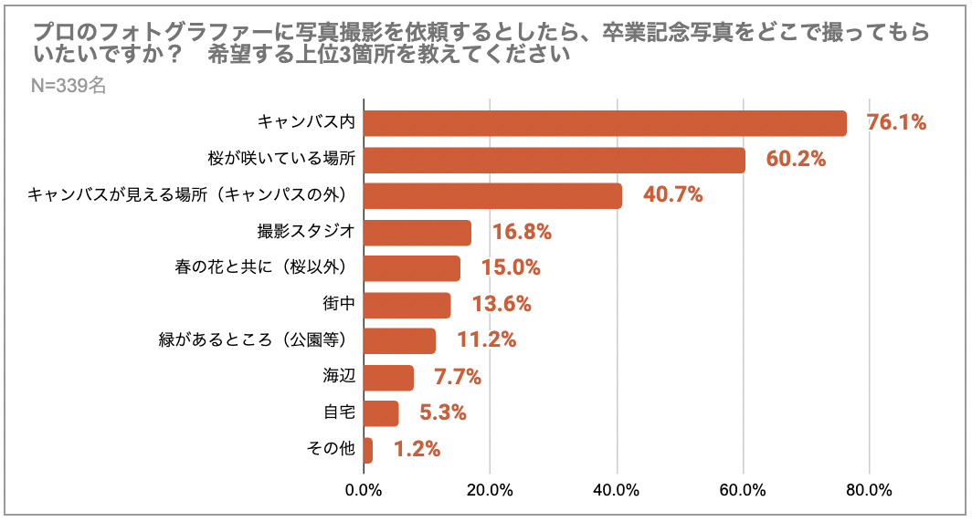 その結果、卒業式で最も楽しみなことが「写真を撮る」ことで、プロに撮ってもらうなら、撮影場所は「キャンパス内」(76.1%)、「桜が咲いている場所」(60.2%)「キャンパスが見える場所」(40.7%)が上位を占め、4位「撮影スタジオ」(16.8%)に大差をつける結果となりました。
