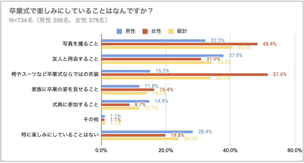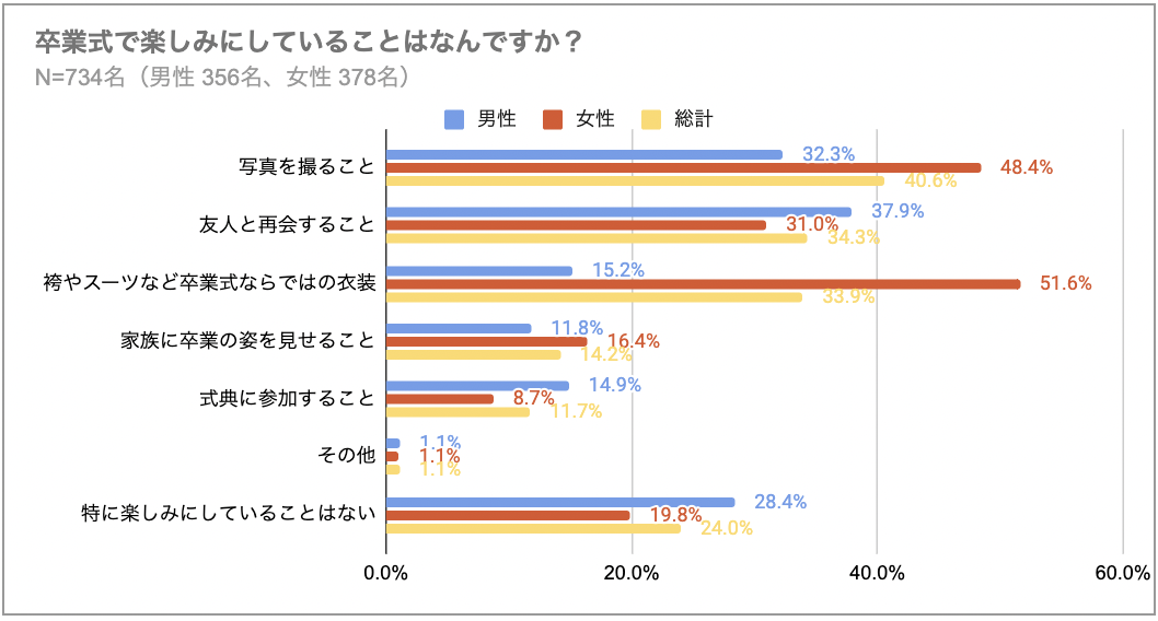 卒業式で楽しみにしていることを男女別で比較すると、女性は「卒業式ならではの衣装を着ること」(51.6%)、男性は「友人との再会」(37.9%)を最も楽しみにしており、「写真を撮ること」は、特別な衣装を着ることや友人との再会と合わせて、卒業式を楽しむメインイベントになっていることがうかがえます。