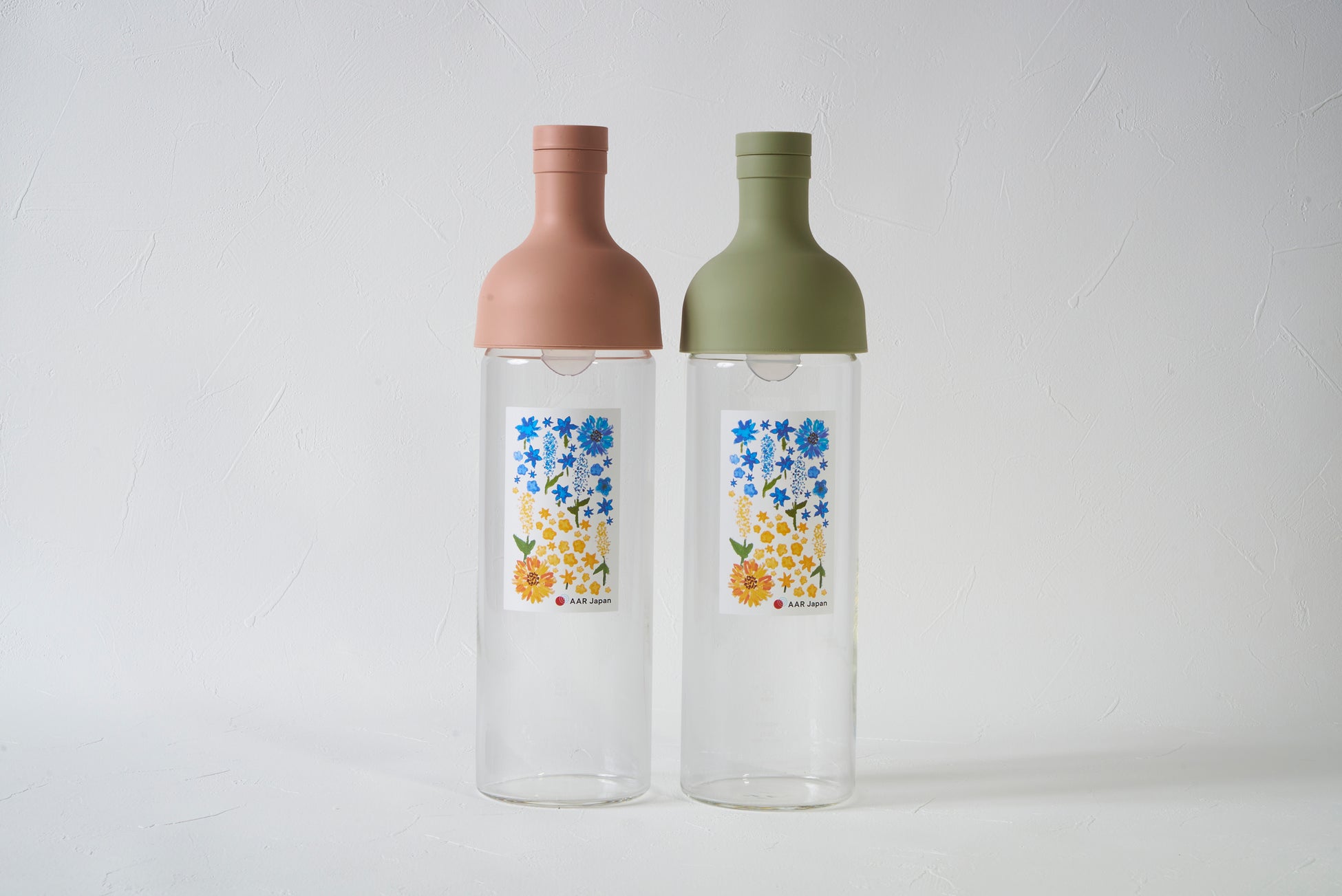 フィルターインボトルは、スモーキーピンクとスモーキーグリーンの2色をご用意。1本あたり約500円が、AARの難民支援活動などに活用されます。ご自宅用だけでなく、内祝いやご挨拶の品としてもぜひご利用ください。
