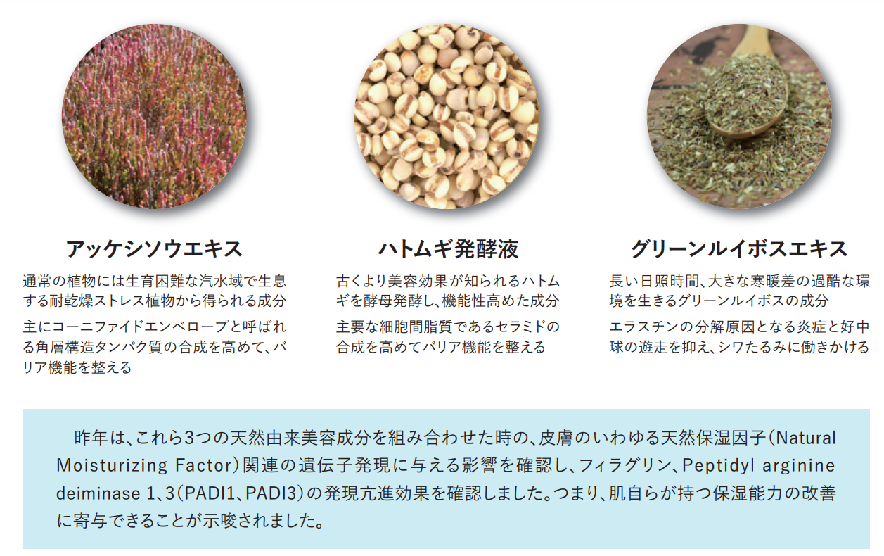 アッケシソウエキス、ハトムギ発酵液、グリーンルイボスエキス、これら3つの天然由来美容成分について引き続き 研究を行い、その成果をお客様へお届けできるよう検討してまいります。