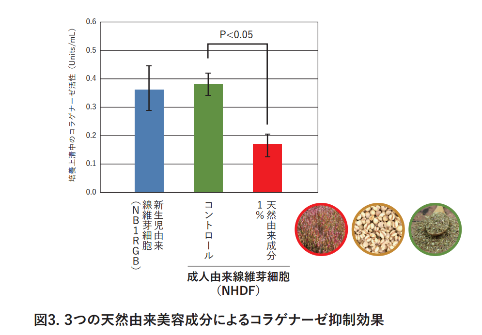 3つの天然由来美容成分は、SASP因子の一つであるコラゲナーゼの活性を抑制することで、肌の老化を抑 制し、また、ハリ・弾力を保つ効果が示唆されました。