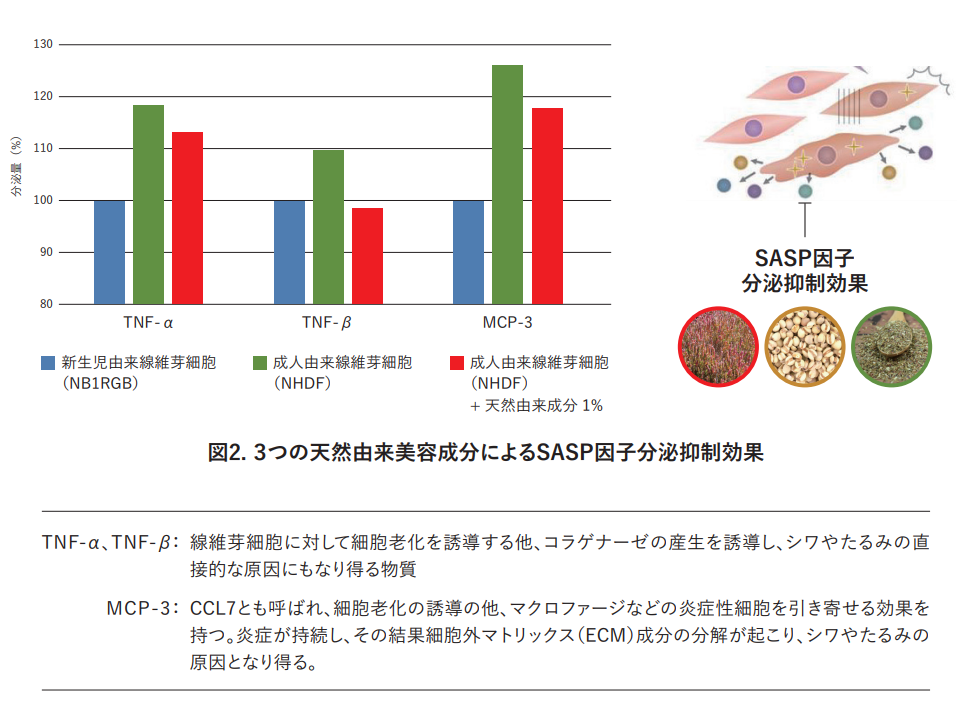 結果を図2に示しました。SASP因子と考えられているTNF-α、TNF-β、MCP-3について、成人由来線維芽細胞で 分泌が亢進し、3つの天然由来美容成分添加で抑制されていることが確認されました。