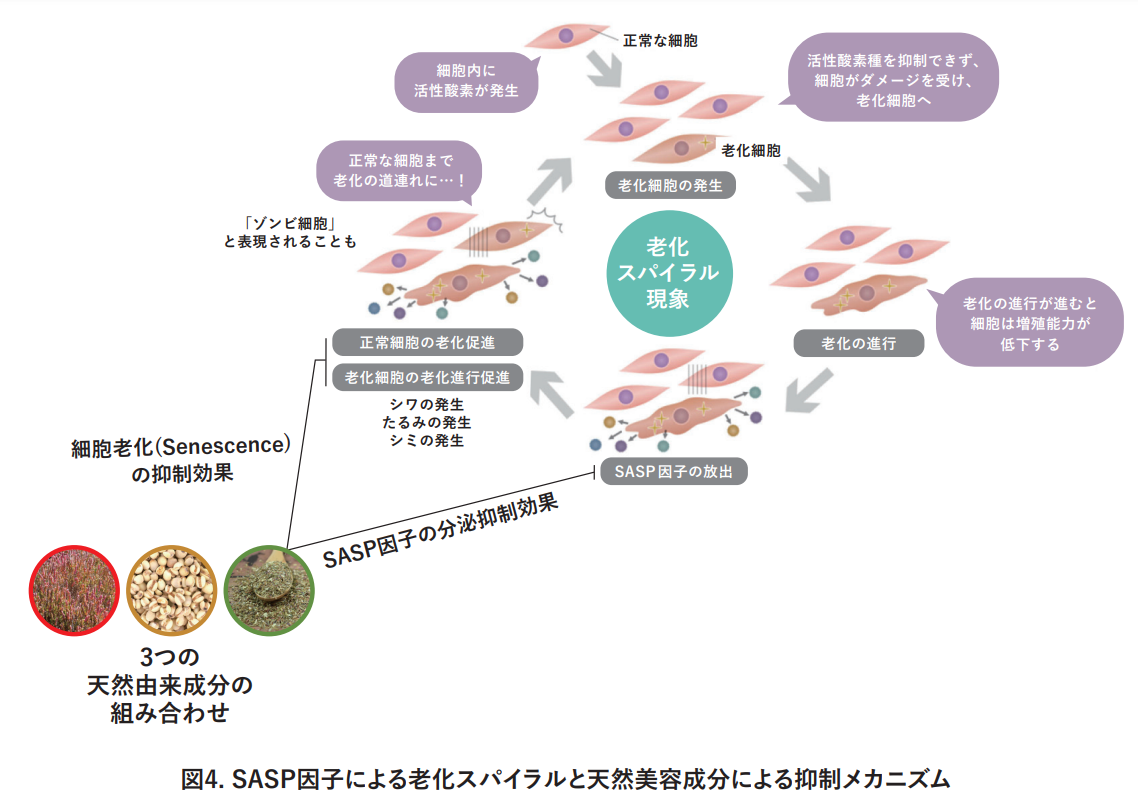 我々が研究している、アッケシソウエキス、ハトムギ発酵液、グリーンルイボスエキスの3つの天然由来美容成分の 組み合わせは、「ゾンビ細胞」とも表現される、老化した細胞によるSASP因子の分泌を抑制し、このような負の連鎖 反応を抑制し、皮膚を若々しく保つ効果が示唆されました(図4)。