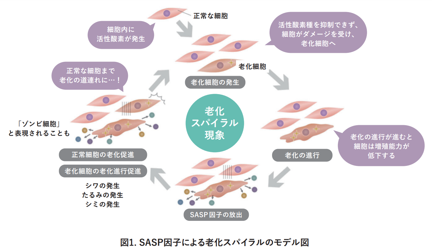 近年、真皮の老化モデルにおいて、SASP因子による老化スパイラルという考え方が広まってまいりました。SASP は、細胞老化随伴分泌現象(Senescence-Associated Secretory Phenotype)とも呼ばれ、生体内での細胞老化に 伴って、その老化した細胞から分泌され、他の正常な細胞を老化に導いてしまう現象が知られてきました。