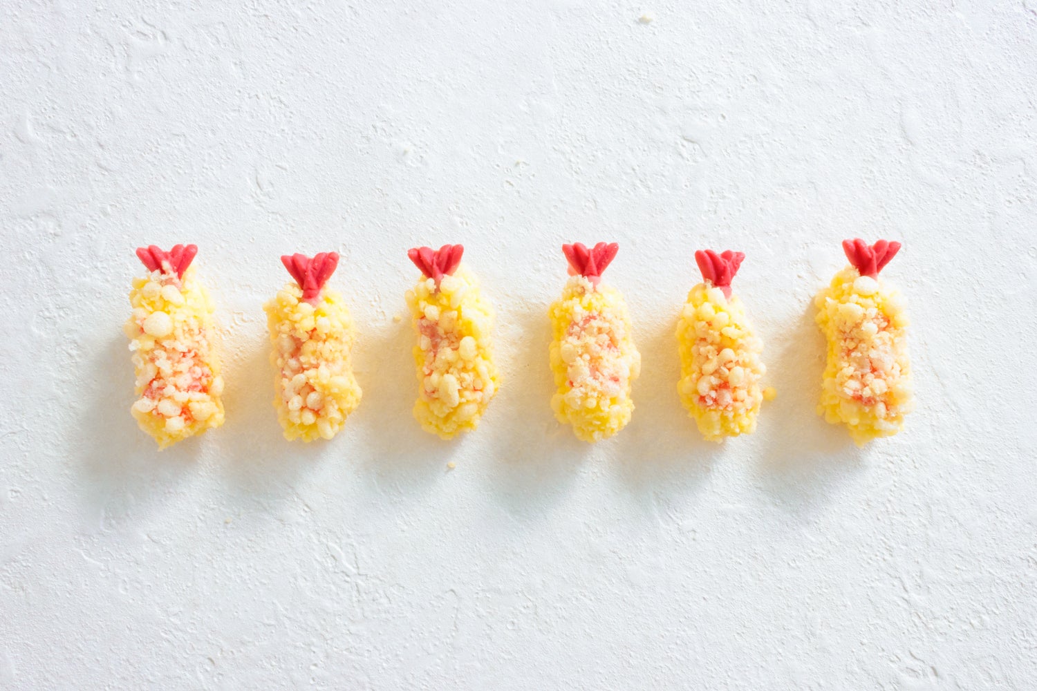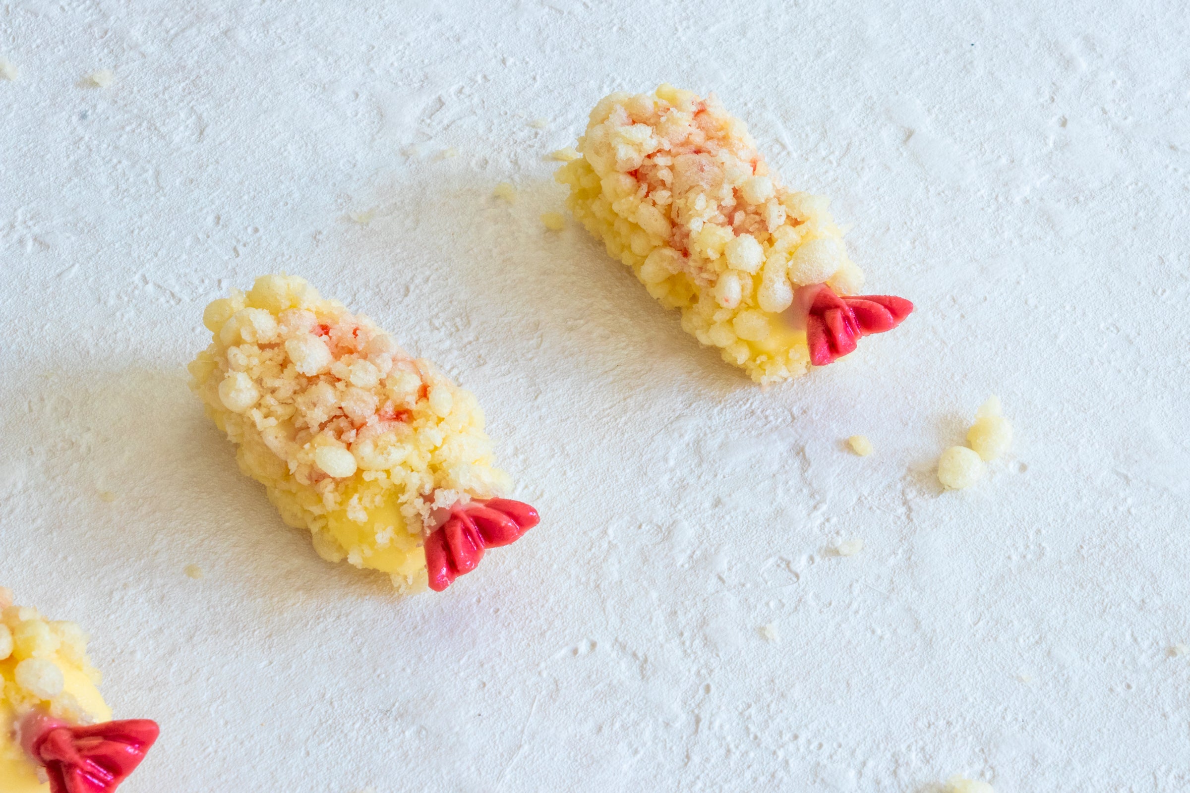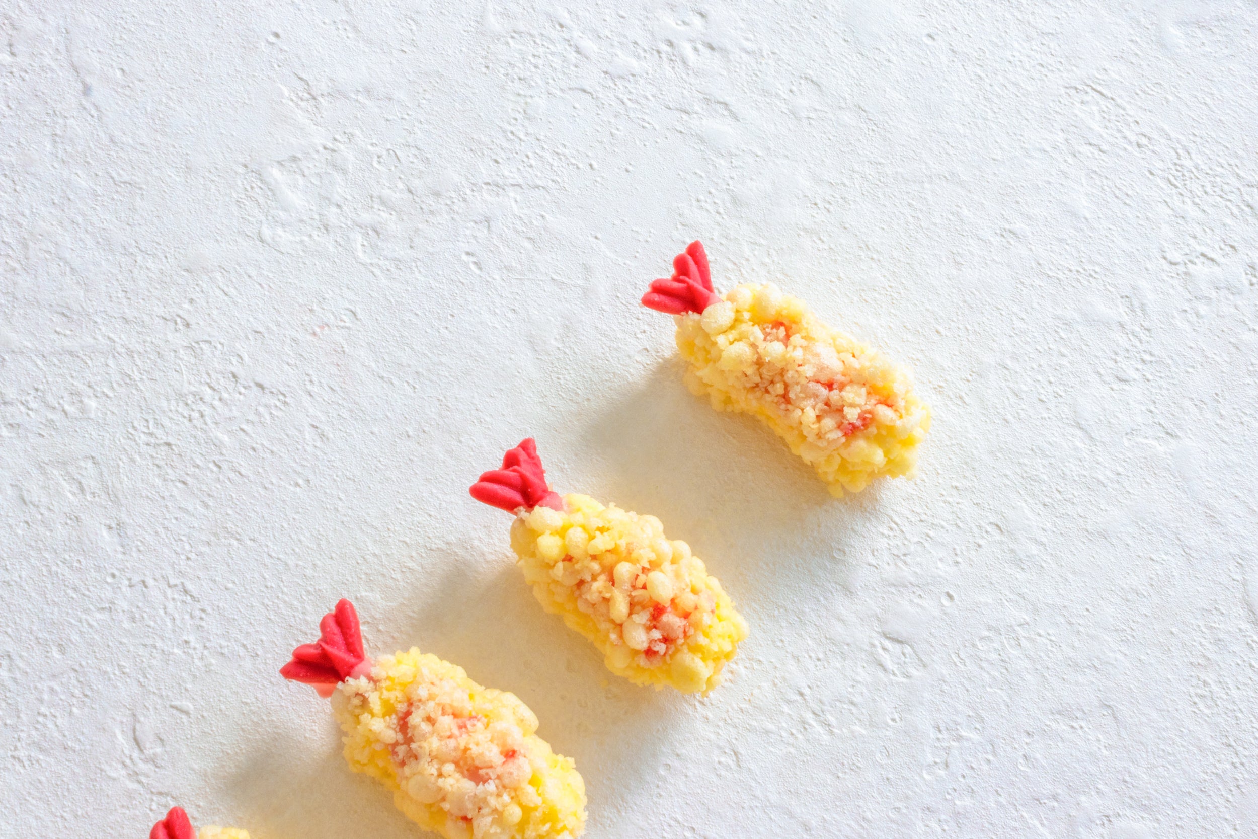 バタークリームと苺のコンフィチュールに、フランボワーズのバターチョコレートの“エビのしっぽ”を飾って、ベルギーのバターチョコレートでコーティングし、サクサクの天ぷらの衣をあしらいました。