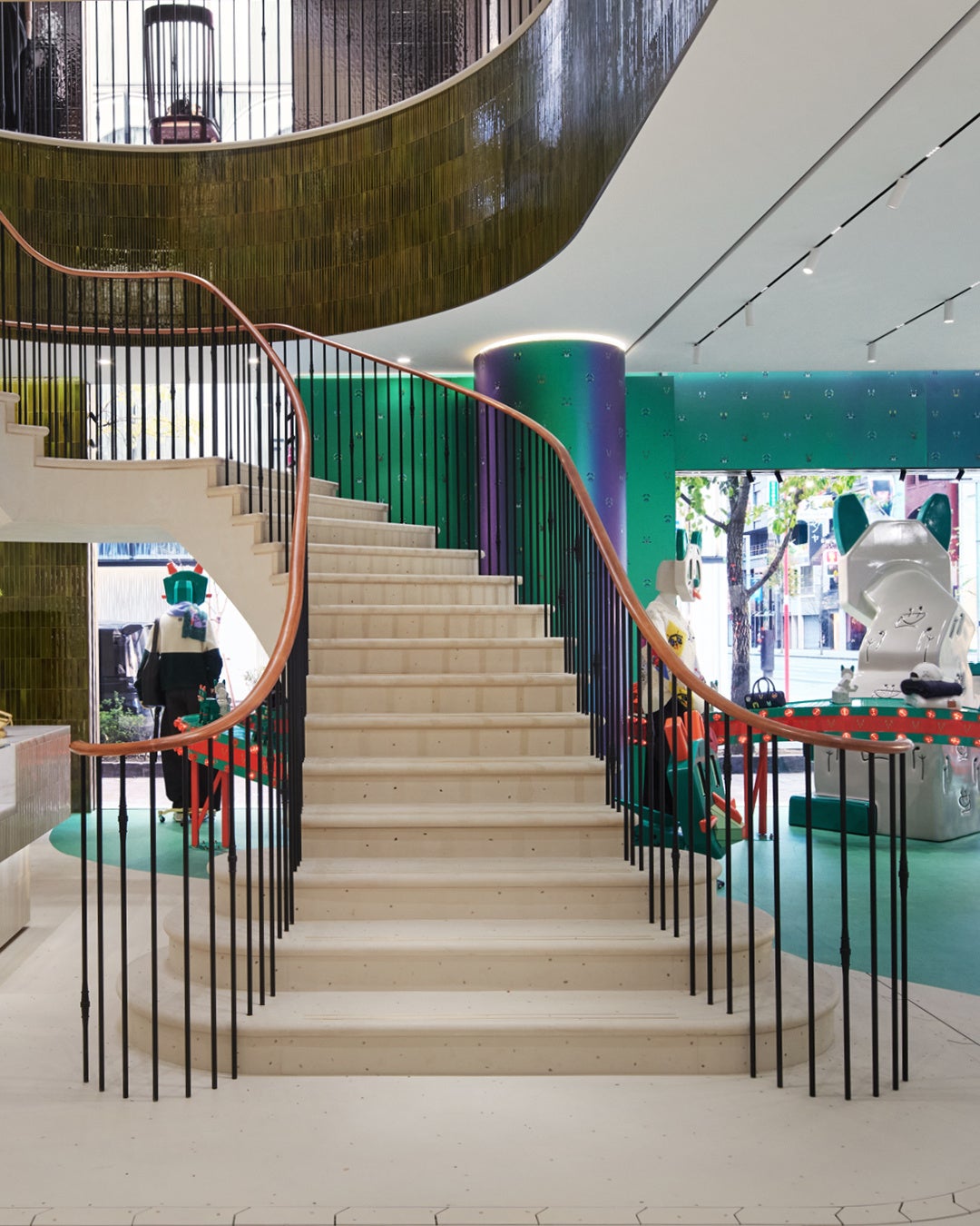 アートコレクターの邸宅のような親密さと、洗練された店舗空間を組み合わせるカサロエベのデザインコンセプトに根ざしながら、この店舗はスペインの感性と日本のデザインの融合を示しています。手仕事で制作された独特なマディグリーンのセラミックタイルは、釉薬の不規則な表情とわずかな窪みが色彩に変化を生み、光を反射します。この深みのあるマディグリーンは、かつて江戸前島の先端にひろがる低湿地帯であった銀座の過去を呼び覚まします。外装のセラミックタイルは内装へと連続し、コンクリートの空間に色彩と輝きをもたらします。店内では、アンシェント グリーン、クリスタロ アイスバーグ、ピンタ ヴェルデ、サハラ ブラウンといった多様な大理石が点在。真鍮の窓枠は、銀貨や金貨を盛んに製造する造幣拠点が置かれた、銀座のもうひとつの過去を伝えます。中央の階段はグリーンのセラミックタイルに囲まれ、手仕事で丁寧に仕立てられた木製の手すりとともに曲線を描きながら、全4フロアを縦につないでいます。自然光が店内を満たし、石材、木材、セラミック、コンクリートが質感豊かに調和する様子をさらに引き立てます。