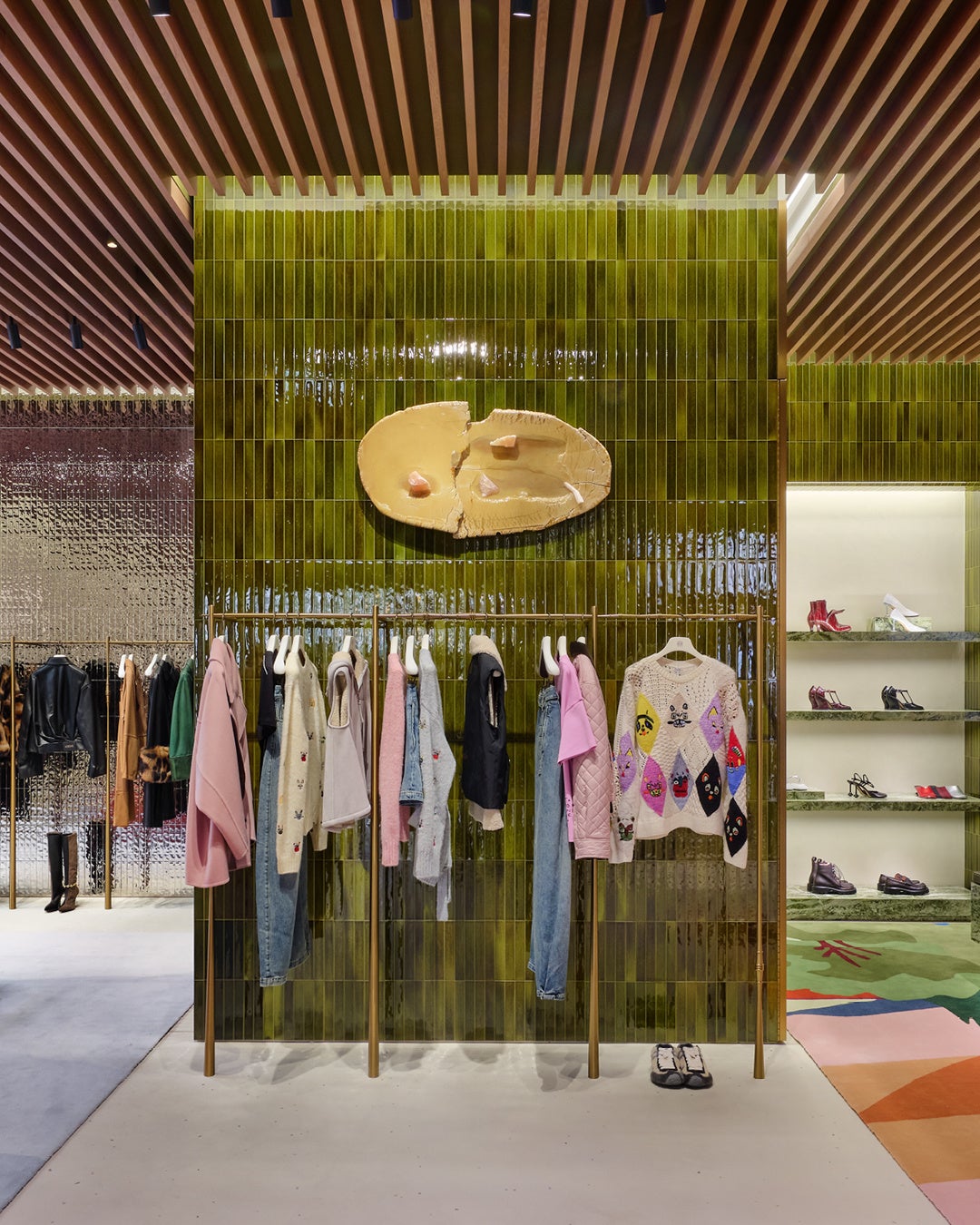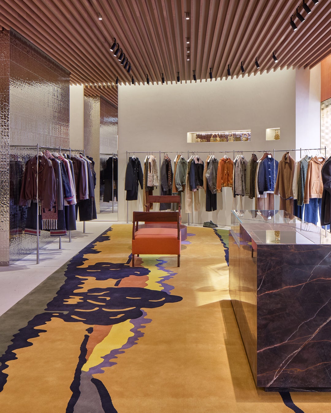 家具は、店内に温かみと落ち着きをもたらしています。ジョージ・ナカシマのミラ チェアやクッション チェア、ヘリット・トーマス・リートフェルトのユトレヒト アームチェアが、イサム・ノグチのAkari E ペンダントランプの繊細さに対置されます。膨らみのあるレザーベンチや、ブラックの鉄製のマティーニ テーブル、焼木材のポディウムなどのロエベのシグネチャーデザインのほか、サステナビリティとイノベーションの探求から生まれたロエベ リクラフテッド コーヒーテーブルも新たに設置されます。このテーブルは、ロエベのアトリエで発生した余剰レザーの95%を再利用して制作された一点物で、新たに命を吹き込まれた素材の美しさを称えています。足元にはスペインで織られた特注のカーペットが敷かれ、イギリスのテキスタイルデザイナーのジョン・アレンによる《Orkney Landscape Sunset》や《Autumn in Orkney》などの明るく抽象的なタペストリーを再解釈しています。