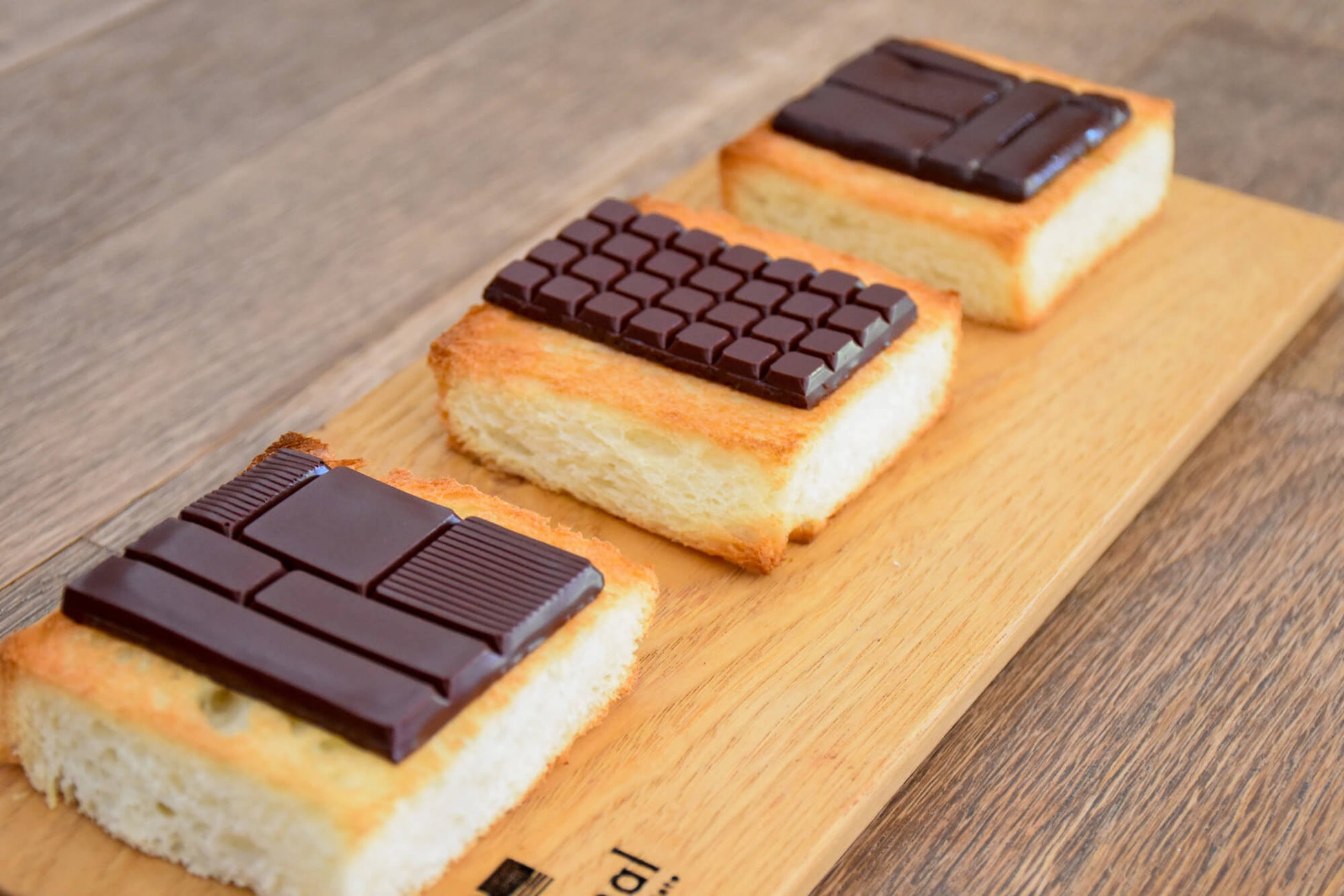 手軽に食べられるサイズのトーストは、小腹がすいたときにもぴったりのボリュームです。おやつはもちろんブランチや軽食にぜひお立ち寄りください。また、上記3種の板チョコレートは店頭で販売していますので、ぜひご自宅でもお好みのパンにのせてお楽しみください。