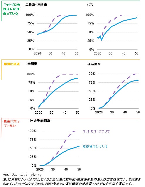 • 現在、今世紀半ばまでにネットゼロを達成する軌道に乗っているのは、道路交通のうち三輪車セグメントのみです