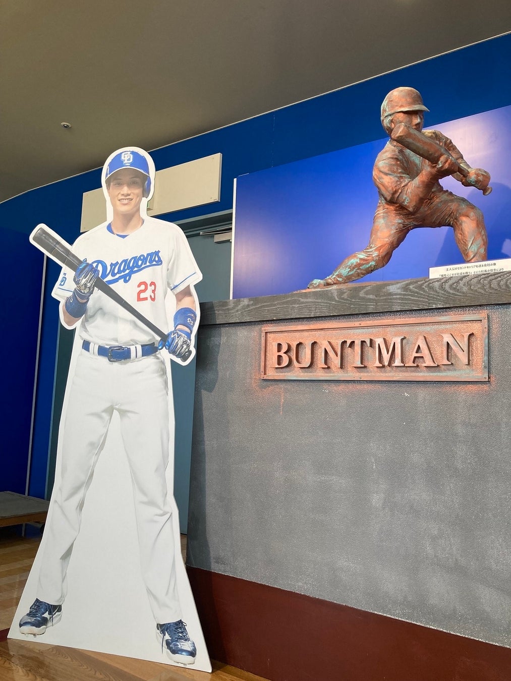 ブースには鈴木の着用アイテム以外に巨大な野球盤、「BUNTMAN」の銅像、「すべての道は野球に繋がる」と書かれた額縁 など、ドラマの小道具も多数展示されている。また放送決定にあたり、立浪和義監督からメッセージも届いていて、ブースではそのコメントも見ることができる。中日ドラゴンズと東海テレビが初めてタッグを組んで制作したドラマ「バントマン」。一足はやく、その世界観を味わって欲しい。