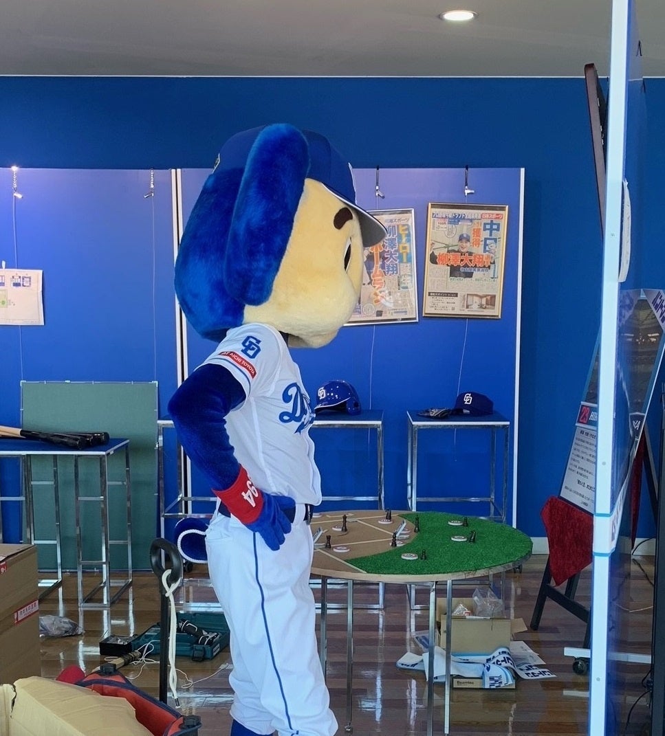 ブースの設営中にやってきたのは、柳澤大翔の大先輩、ドアラ!突然の訪問に、スタッフもびっくりだ。ドアラが熱心に見ていたのは、鈴木の野球シーンのパネル。これらは、バンテリンドーム ナゴヤで撮影されていて、注目シーンの1つなので、ぜひ見てほしい。