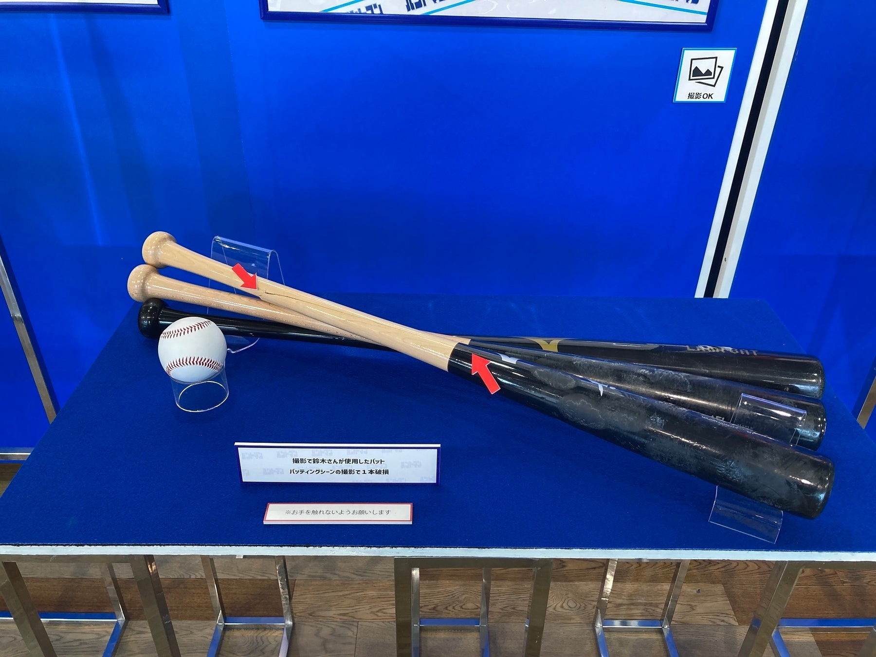 今月9日からバンテリンドームで始まったのは、実際に鈴木がドラマで使用しているバットやヘルメッ ト、グローブ、スパイクなどの特別展示。そこには折れたバットもあり、鈴木がプロ選手並みのトレ ーニングをつんだことがうかがえる。