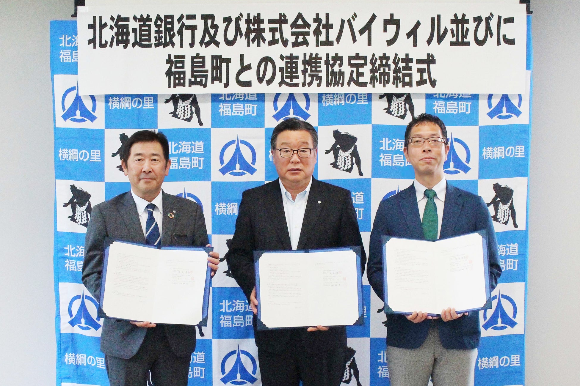 日本全国47都道府県のカーボンニュートラル実現を目指す株式会社バイウィル(本社:東京都中央区、代表取締役社長:下村 雄一郎、以下「バイウィル」)は、北海道松前郡福島町(町長:鳴海 清春、以下「福島町」)、株式会社北海道銀行(本店:北海道札幌市、取締役頭取:兼間 祐二、以下「北海道銀行」)と、カーボンニュートラルおよびサーキュラーエコノミーの実現を目的とした連携協定を締結しました。