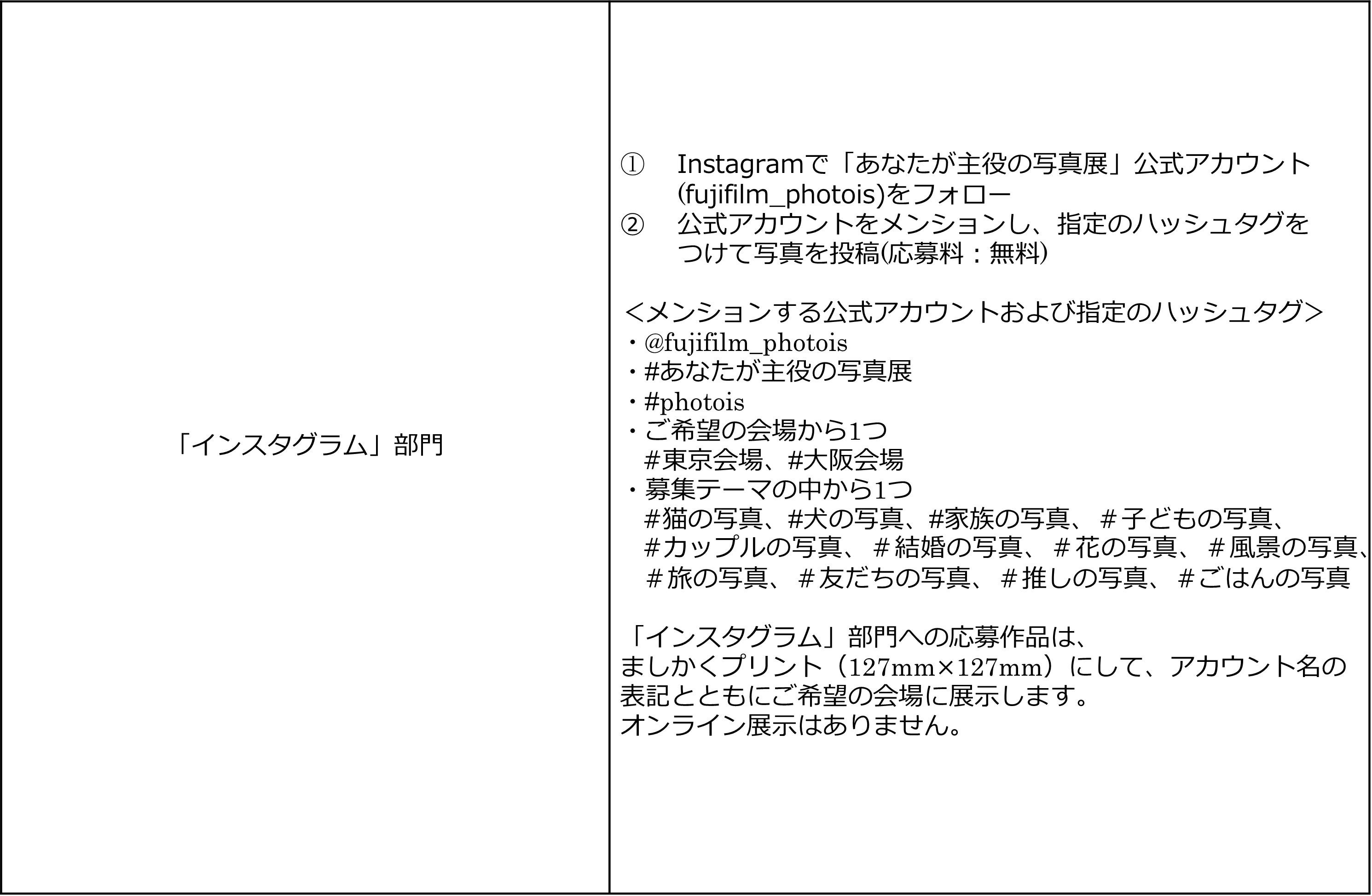 Instagramの「あなたが主役の写真展」公式アカウント(fujifilm_photois)をフォローの上、アカウントをメンションし、指定のハッシュタグをつけて写真を投稿するだけで、簡単に応募できる部門です。会場では、ましかくプリント(127mm×127mm)にした作品を展示します。