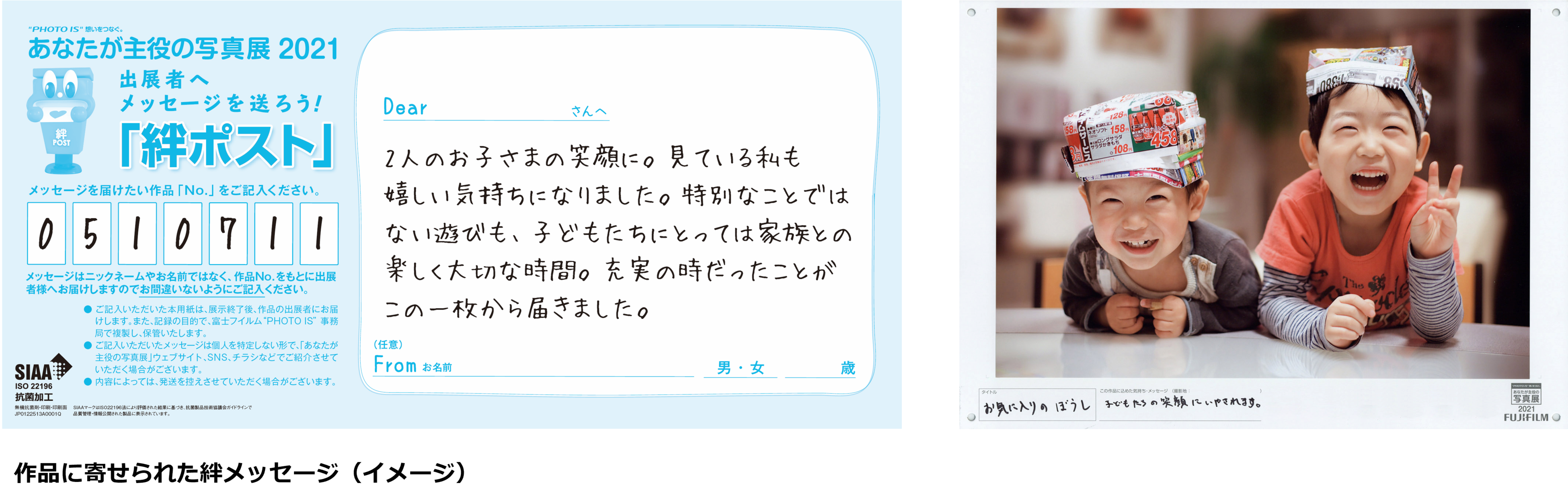 また、本写真展のテーマである「想いをつなぐ」を体験できる企画として2012年にスタートした『絆メッセージ』を今年も実施します。『絆メッセージ』では、来場者が出展者への手書きのメッセージを各会場にある「絆ポスト」に投函いただくと、展示終了後にそのメッセージを出展者に郵送でお届けします。今年は、オンライン展示サイトでも「絆ポスト」を設置し、出展者と来場者の間で交わされる写真を通じたコミュニケーションで新たな“絆”を生み出していきます。