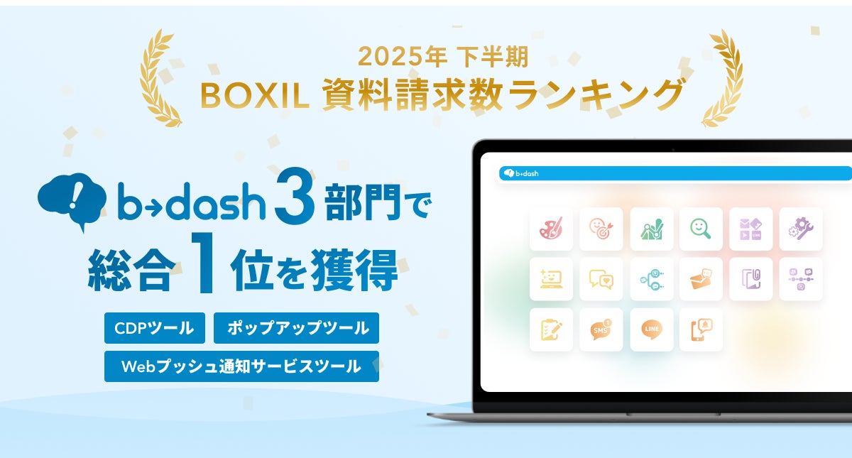 株式会社データX(本社:東京都新宿区、代表取締役社長:安部泰洋)が提供するデータマーケティングクラウドシステム「b→dash」は、スマートキャンプ株式会社(以下「スマートキャンプ」)が発表する「2025年下半期 BOXIL資料請求数ランキング」において、「CDPツール」「ポップアップツール」「Webプッシュ通知サービス」の3つのカテゴリで総合1位を受賞したことをお知らせいたします。今回、b→dashが受賞した上記3カテゴリの総合1位は、該当カテゴリにおいて、対象期間内(2025年7月1日〜2025年12月31日)にユーザーからの資料請求数が最も多かったサービスとして選出されました。