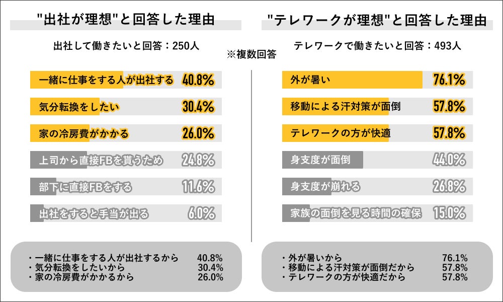 夏の働き方で「出社が理想」と回答した250人の出社を希望する上位3つの理由は、「一緒に仕事をするメンバーが出社するから」が40.8%と最多となり、続いて「気分転換をしたいから」が30.4%、「テレワークだと冷房費がかかるから」が26.0%となりました。一方、夏の働き方で「テレワークが理想」と回答した493人のテレワークを希望する上位3つの理由は、「外が暑い」が76.1%と最多となり、続いて「移動による汗対策が面倒」と「テレワークの方が快適」が同率で57.8%となりました。