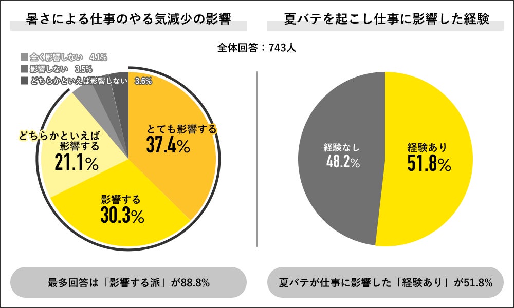 回答者全体の743人に夏の暑さは仕事のやる気減少に影響するかを聞くと、88.8%が「影響する派」で、11.2%が「影響なし派」を回答しました。影響する派の内訳は、「とても影響する」が37.4%、「影響する」が30.3%、「どちらかといえば影響する」が21.1%となりました。同回答者に夏バテを起こし仕事に影響した経験の有無を聞くと51.8%が「ある」で、48.2%が「ない」と回答し、影響あり派が過半数を占めました。