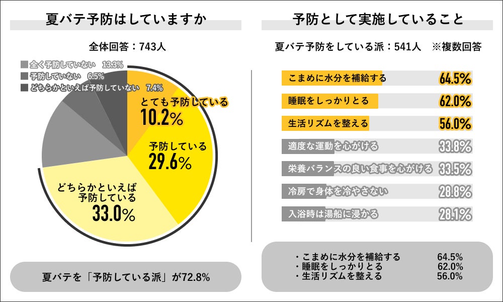 回答者全体の743人に夏バテ予防の有無を聞くと、「している派」が72.8%、「していない派」が27.2%と予防をしている派が過半数を占めました。予防として実施していることの上位3つは、「こまめに水分を補給する」が64.5%と最多で、続いて「睡眠をしっかりとる」が62.0%、「生活リズムを整える」が56.0%でした。