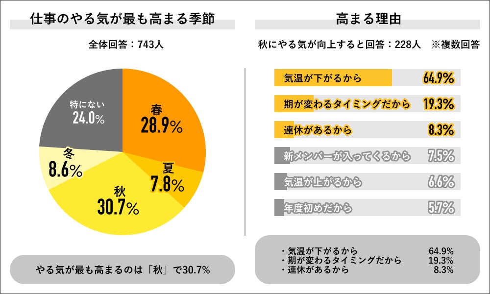 回答者全体の743人に仕事のやる気が最も低下する季節を聞くと、「秋」が30.7%と最多で、「春」が28.9%、「特にない」が24.0%、「冬」が8.6%、「夏」が7.8%となりました。秋にやる気が向上すると回答した228人に主な理由を聞くと「気温が下がるから」が64.9%と他の項目に大差をつけ、続いて「期が変わるタイミングだから」が19.3%、「連休があるから」が8.3%でした。