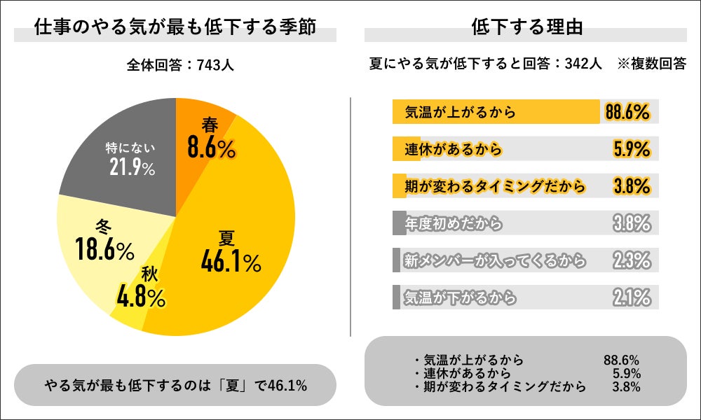 回答者全体の743人に仕事のやる気が最も低下する季節を聞くと、「夏」が46.1%と最多で、「特にない」が21.9%、「冬」が18.6%、「春」が8.6%、「秋」が4.8%となりました。夏にやる気が低下する342人に主な理由を聞くと「気温が上がるから」が88.6%と他の項目に大差をつけ、続いて「連休があるから」が5.9%、「期が変わるタイミングだから」が3.8%でした。