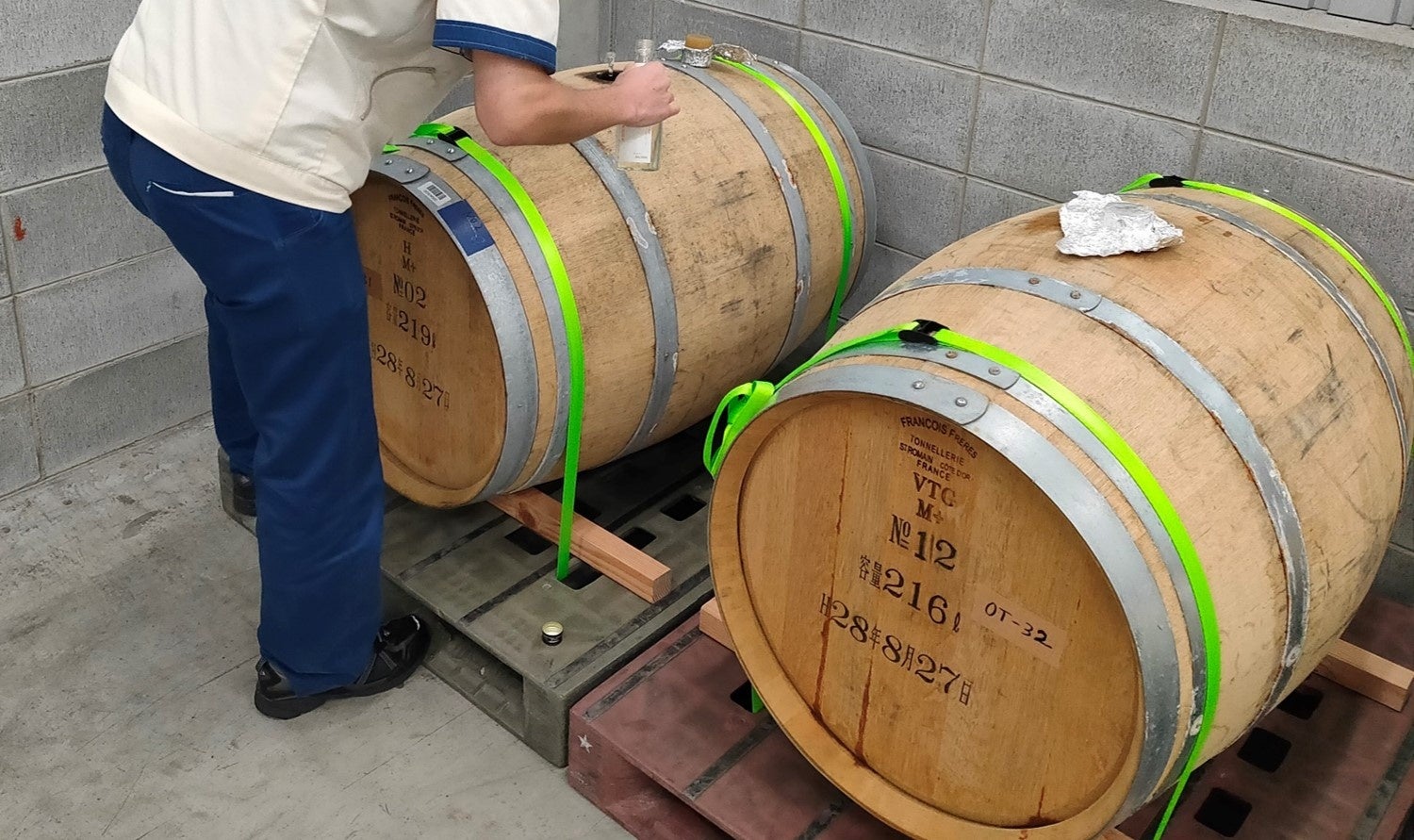 白ワイン樽に貯蔵したお酒をブレンドしています。