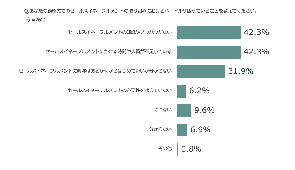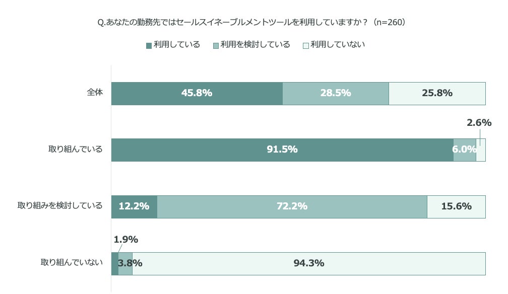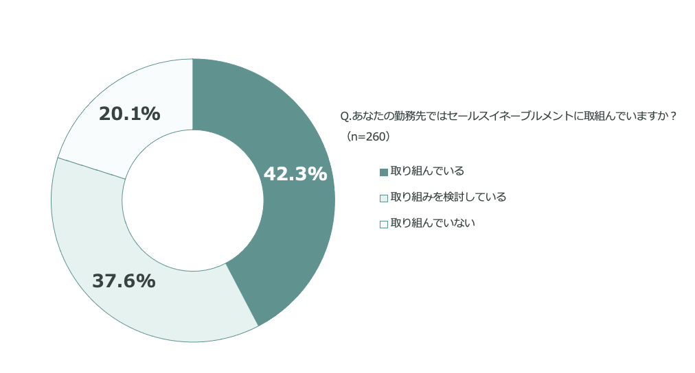 そんな中、海外では主流となりつつある営業組織を戦略的に強化するさまざまな取組みの総称である「セールスイネーブルメント」。国内でも注目を集め「セールスイネーブルメント」に取組んでいる法人営業組織が増えてきていることが分かりました。