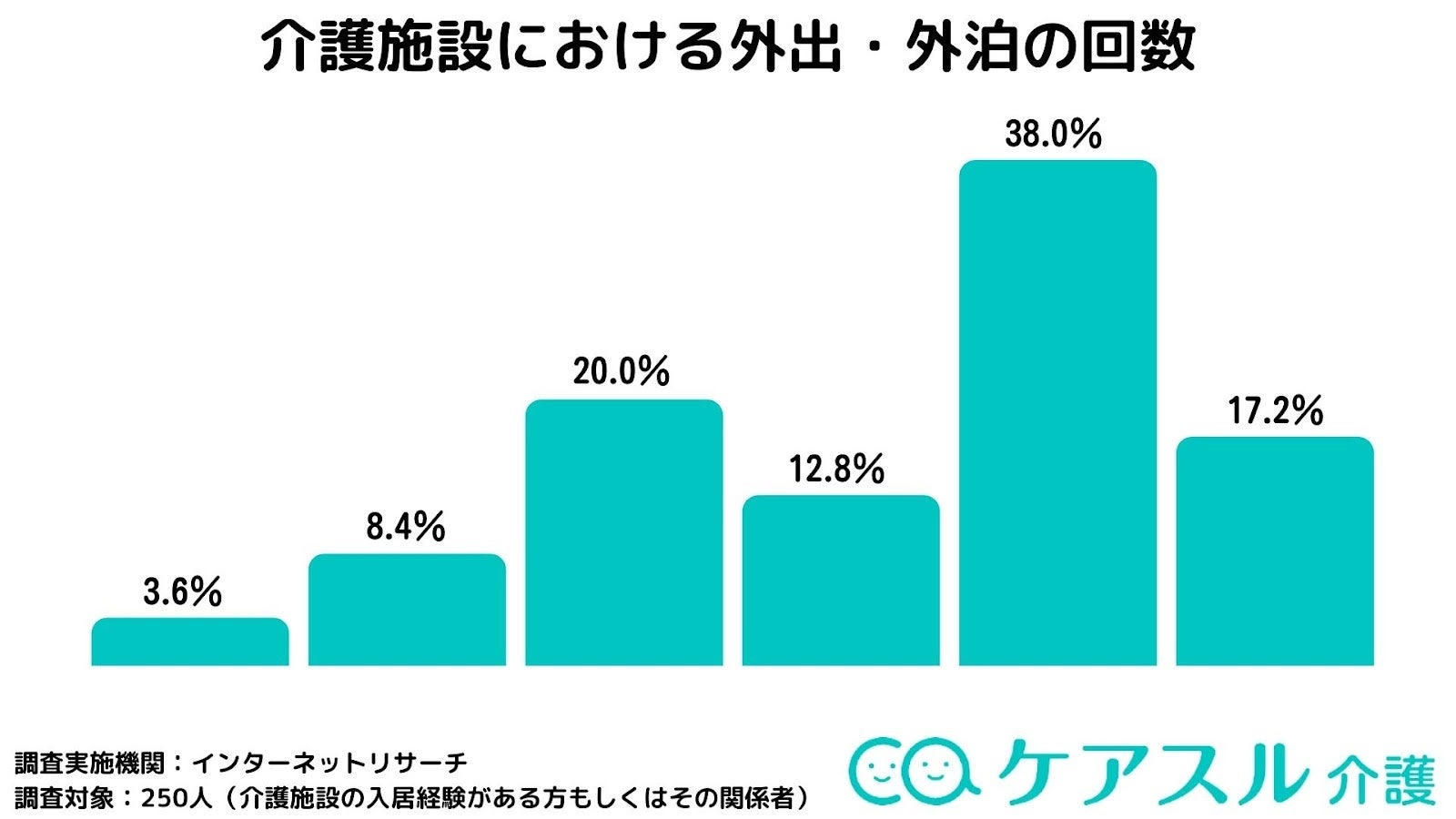 介護施設における外出・外泊の頻度としては、「月に1回」と回答した方が最も多く、全体の38.0%を占める。