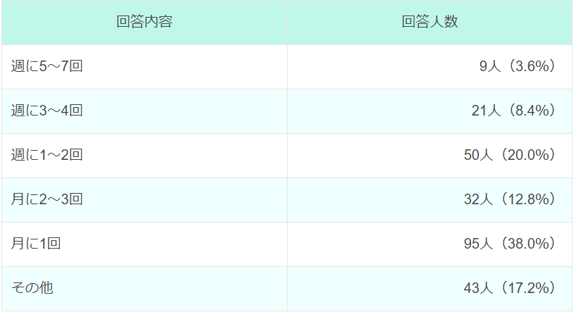 調査の結果、回答が最も多かったのは「月に1回」の38.0%であり、次に「週に1〜2回」の20.0%が並びました。なお、その他と回答した方を除く約8割の方は月に1回以上の外出をしていることが分かりました。
