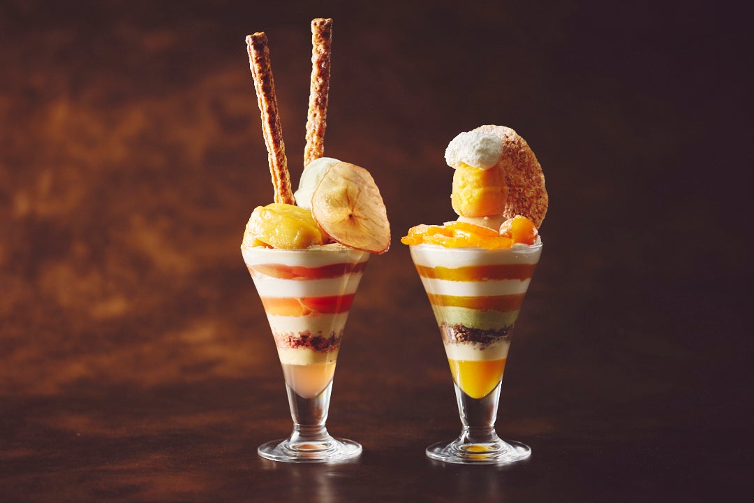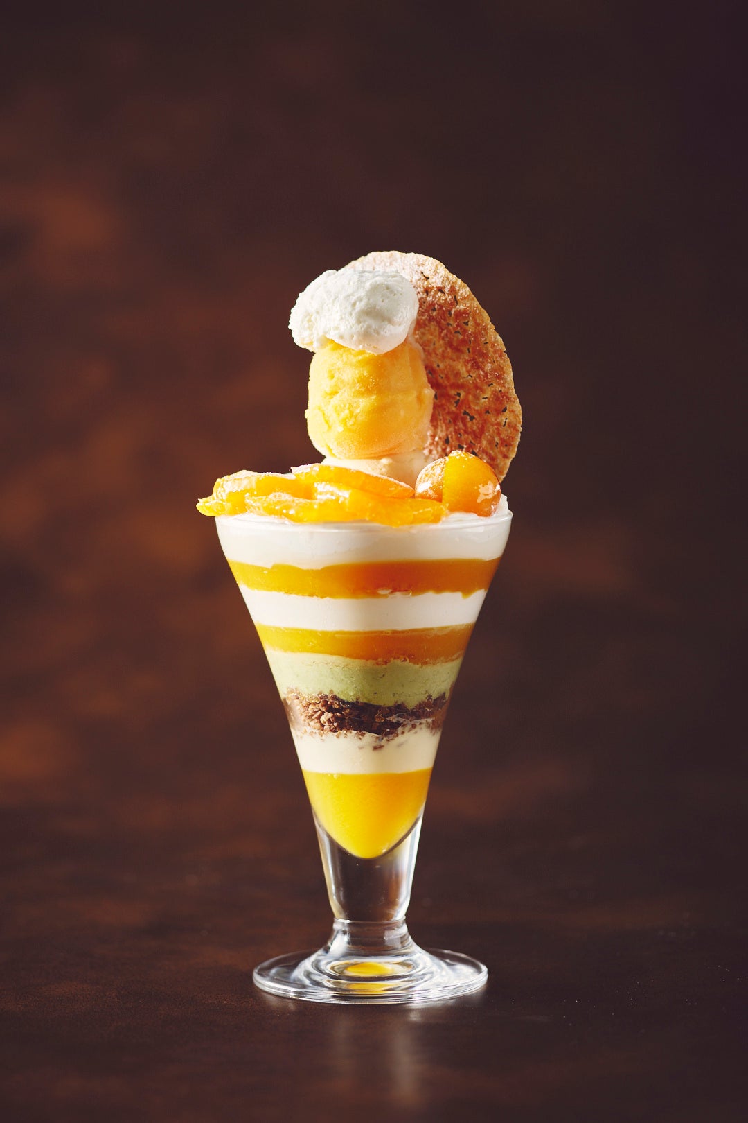 みかんパフェには異なるフレーバー3種のチーズとあわせて、シトラスが薫るなめらか食感の濃厚チーズケーキ風に。奥深い濃厚なくちあたりのなかに、みかんや金木犀のジュレのもたらす清涼感のある甘味と酸味が広がり、食べすすめるたび味わいの変化とともにすっきりとしたあと味が印象的のパフェです。