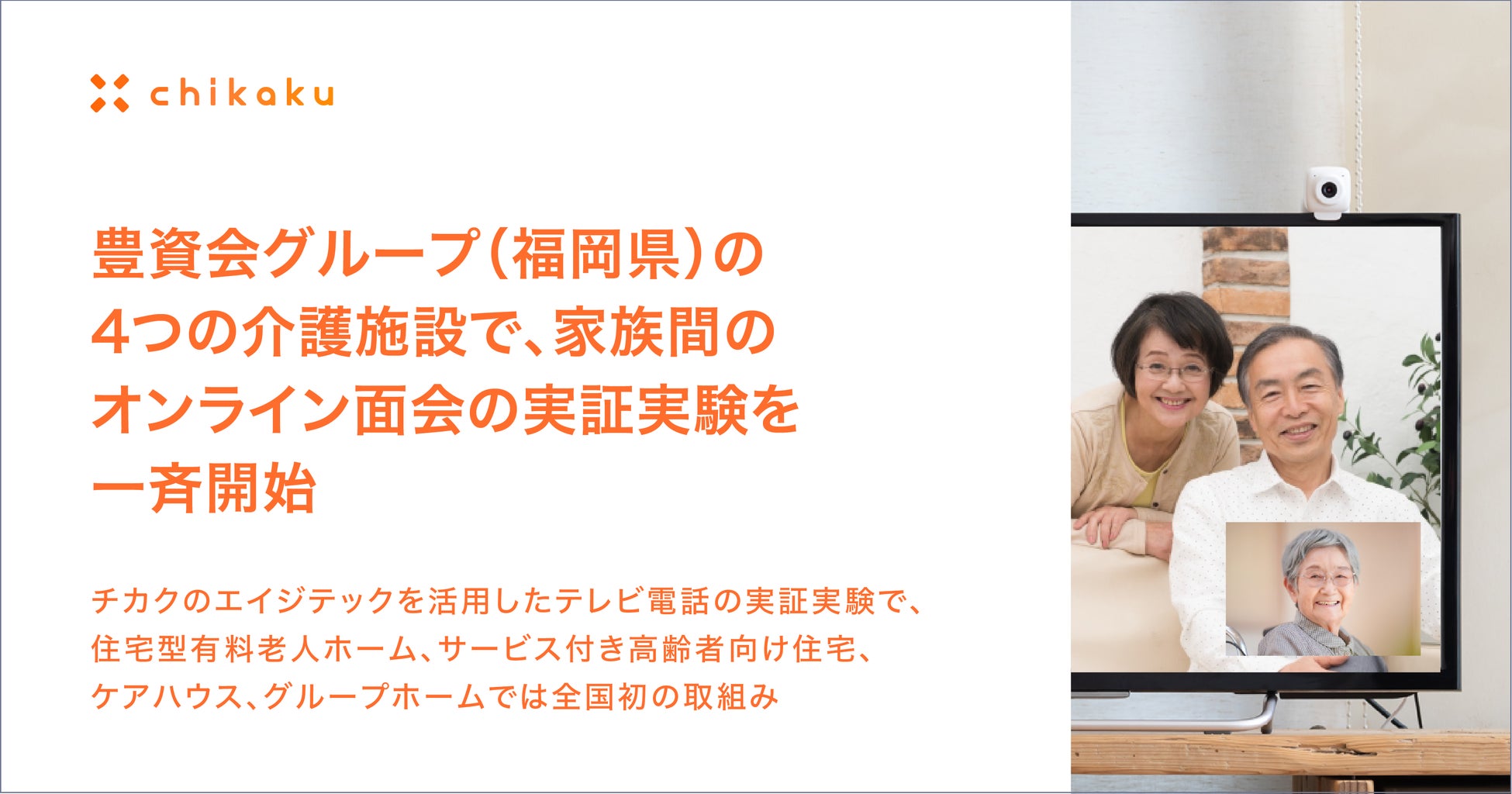 株式会社チカク(以下「チカク」)は、福岡県内で医療法人や社会福祉法人を運営する豊資会グループ(福岡県古賀市、代表:加野資典、以下「豊資会」)の協力のもと、住宅型有料老人ホーム「ハイマート桑の実」、サービス付き高齢者向け住宅(以下、「サ高住」)「ハイマート橘」、「ケアハウスどんぐり」、「グループホームどんぐり」の4つの介護施設にて、チカクのテレビ電話を活用したオンライン面会の実証実験を5月21日より開始いたします。