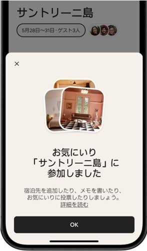 一緒に旅行するみんなでお気にいりを簡単に共有して、メモの追加、宿泊先の投票、旅行日程や宿泊人数の調整を行うことができるようになりました。また、ほかの人とお気にいりを共有すると、アプリによってお気にいりの作成が提案されます。