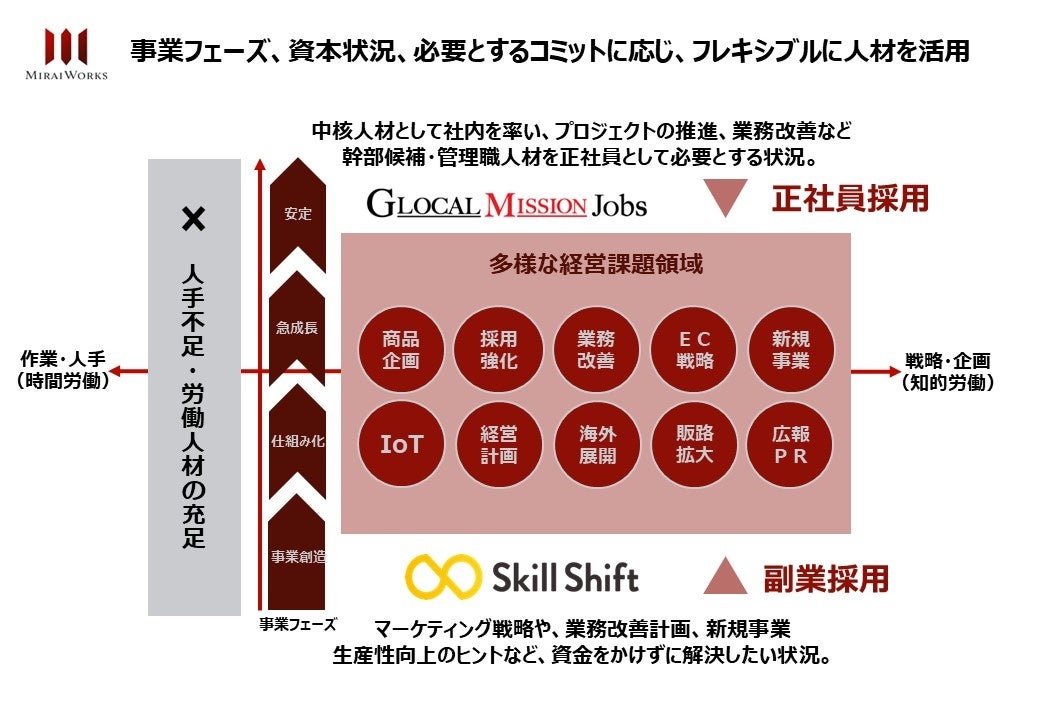 当社は、地方転職プラットフォーム『Glocal Mission Jobs(GMJ)』(https://glocalmissionjobs.jp/)と、副業マッチングプラットフォーム『Skill Shift』(https://www.skill-shift.com/)を運営し、地方中小企業が都市部の優秀な人材を経営幹部や後継者として、正社員採用、または副業採用をするための支援を行っています。